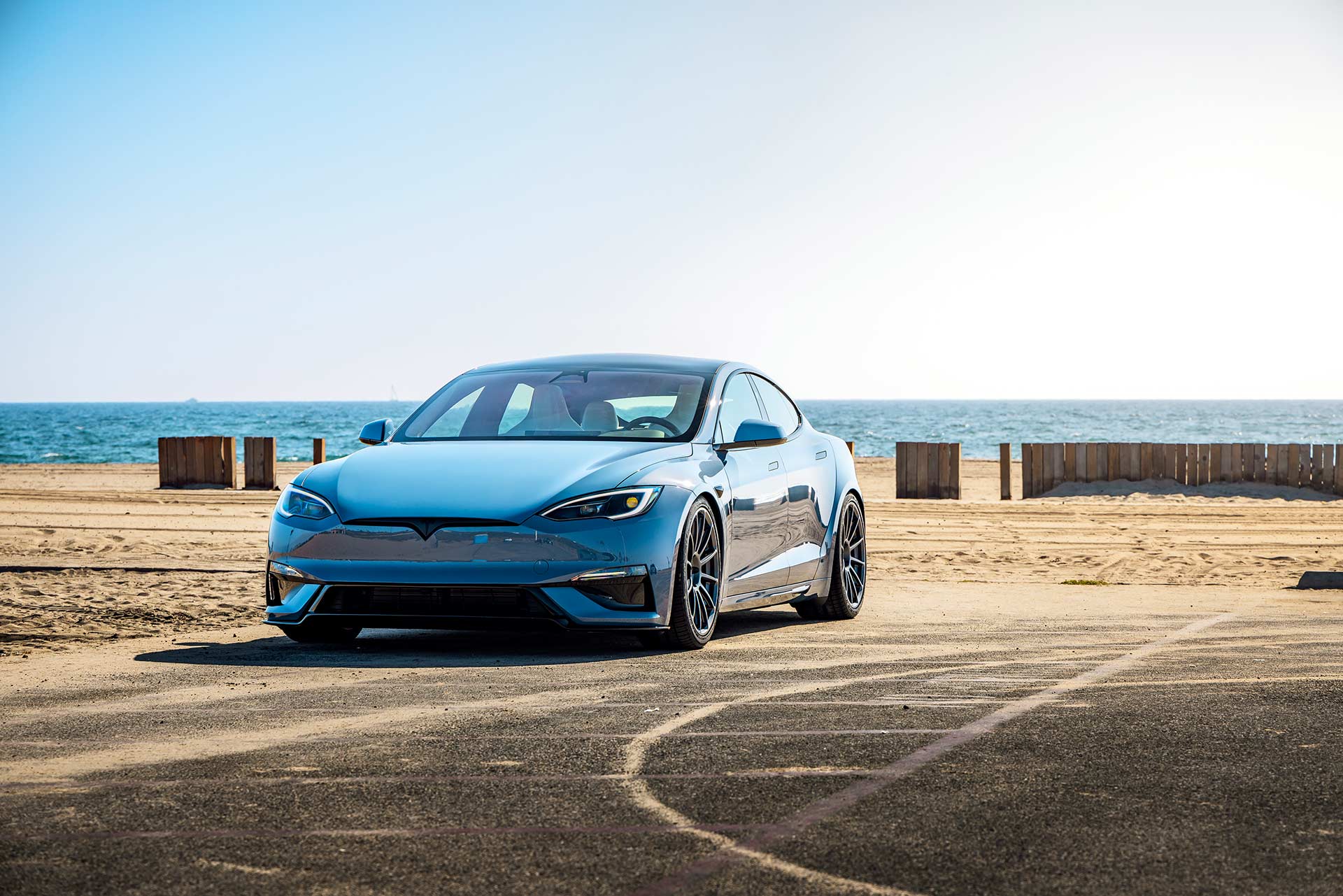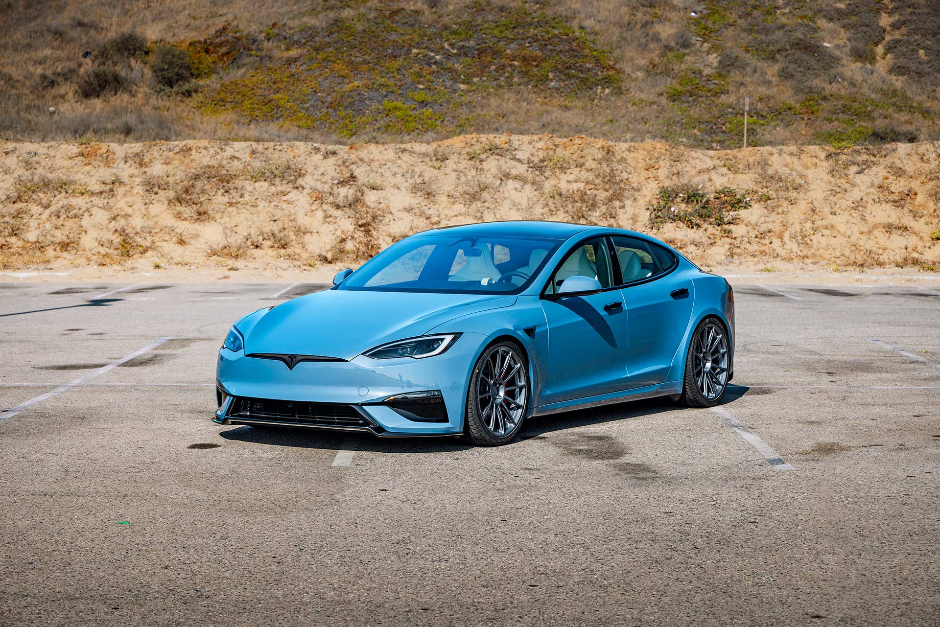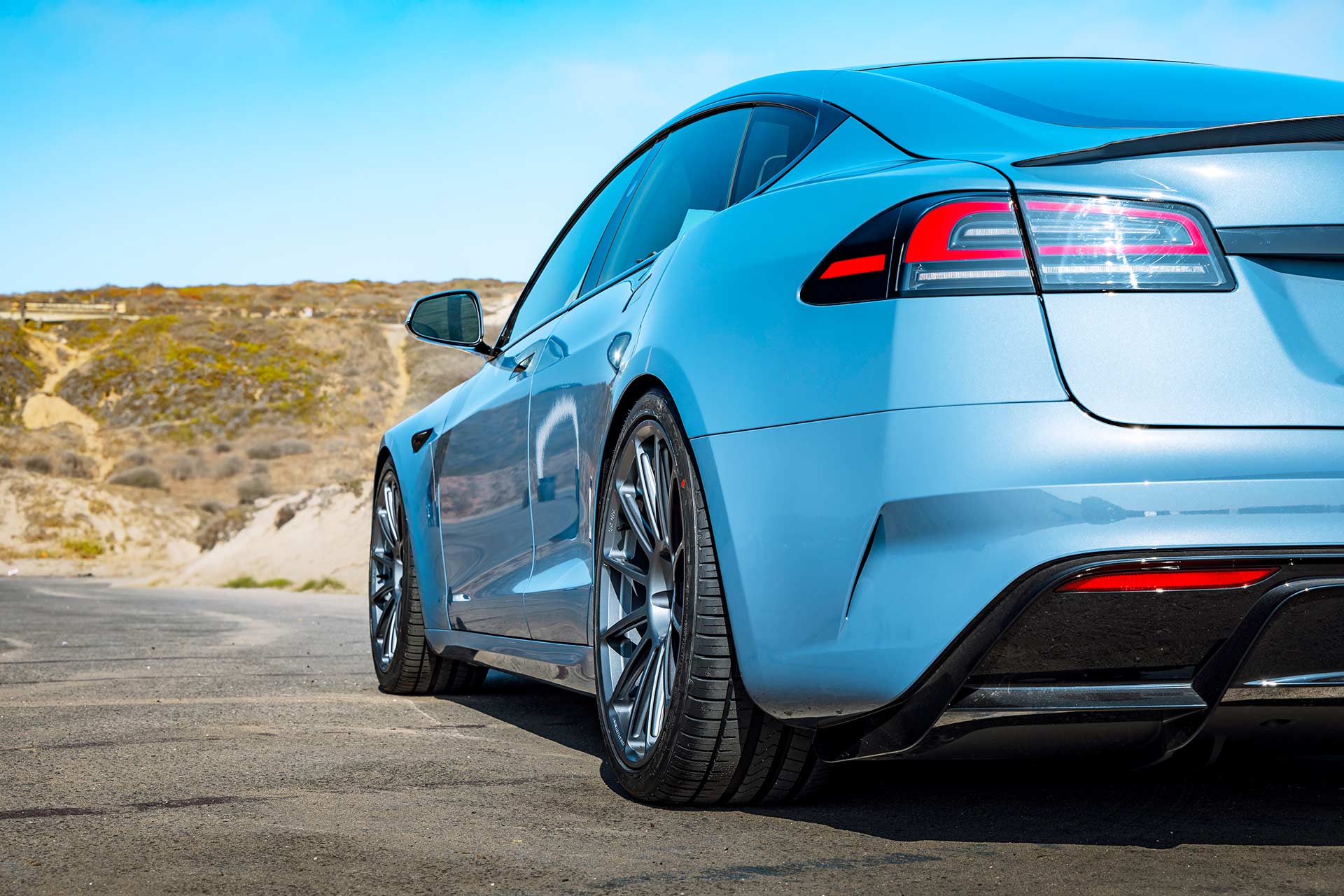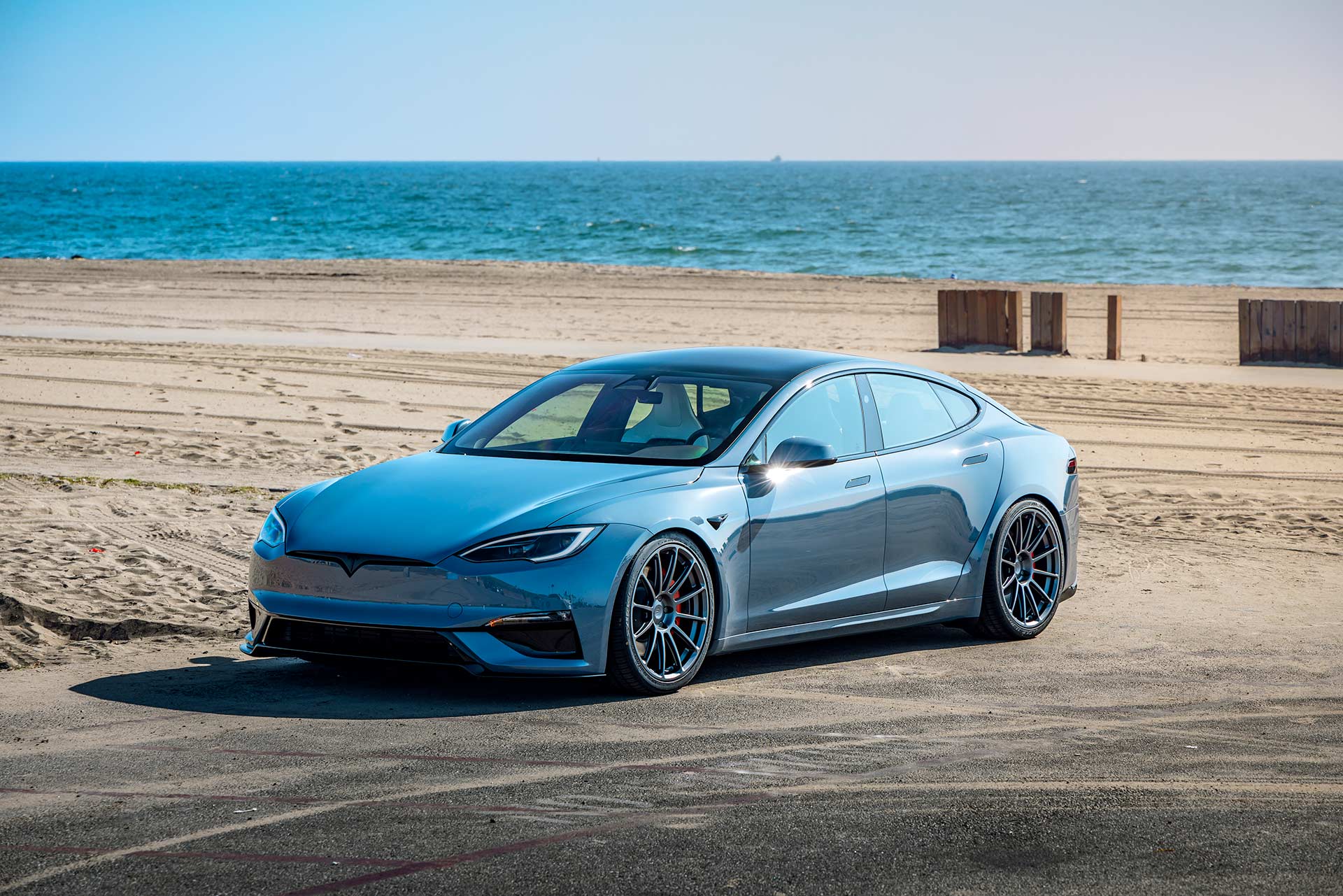 2026 Frost Blue Metallic Tesla Model S Plaid with UP Forged UP-03 Wheels in Satin Titanium