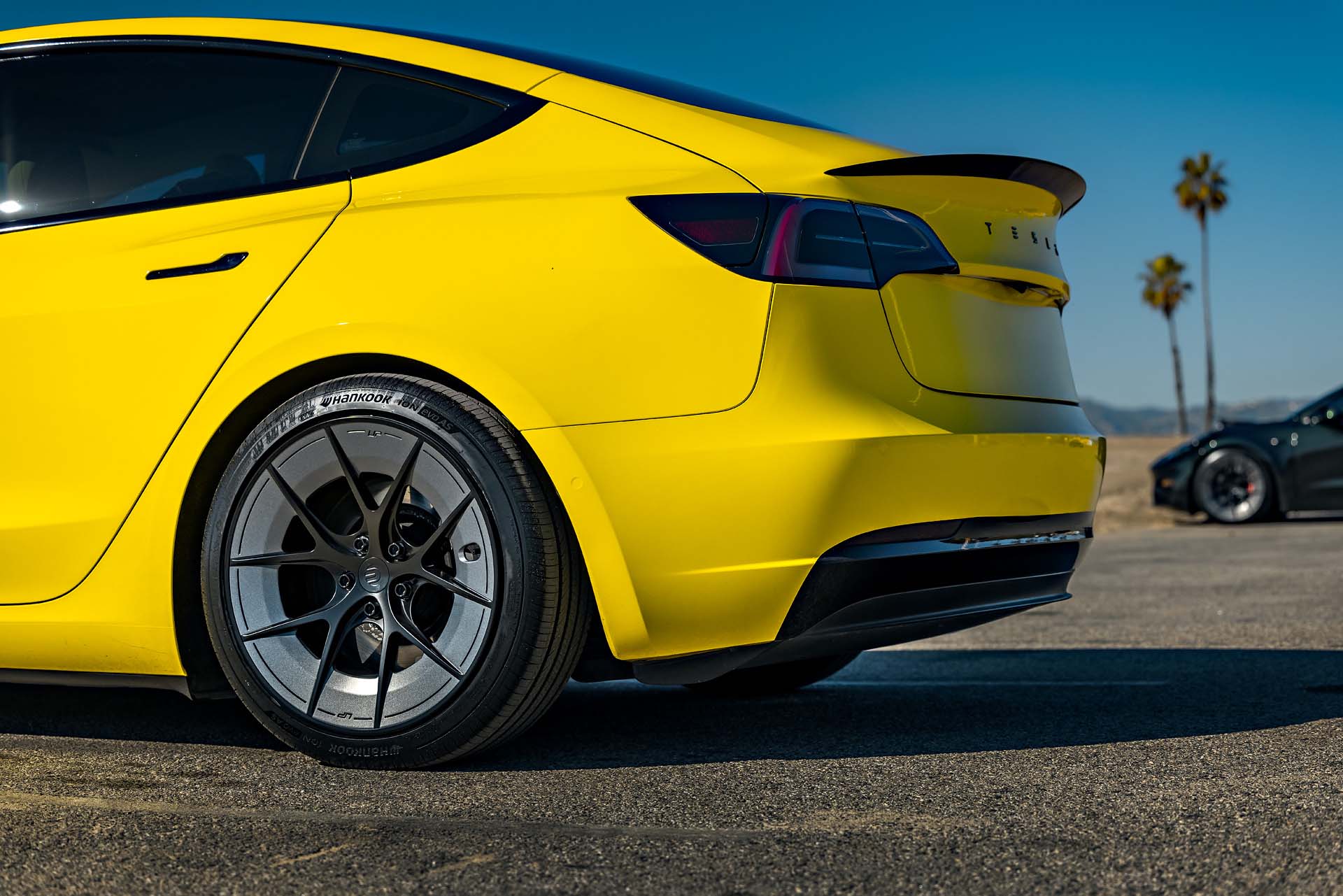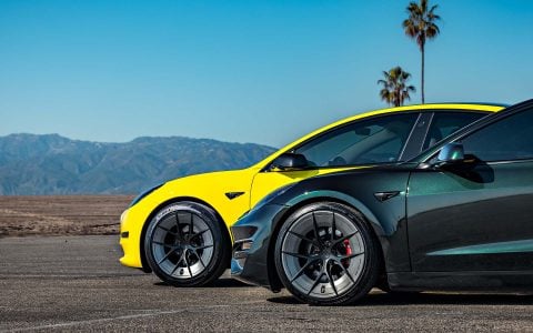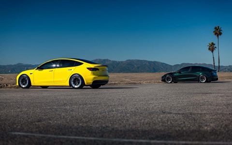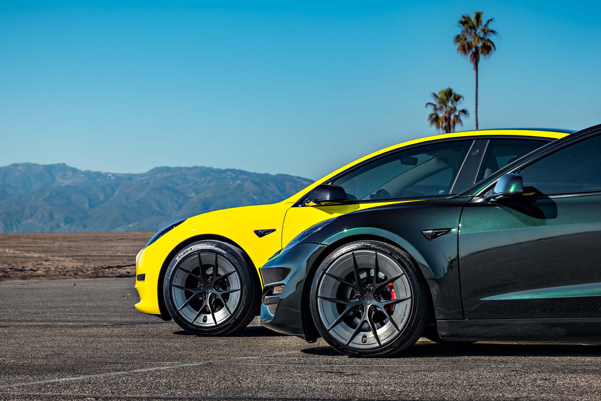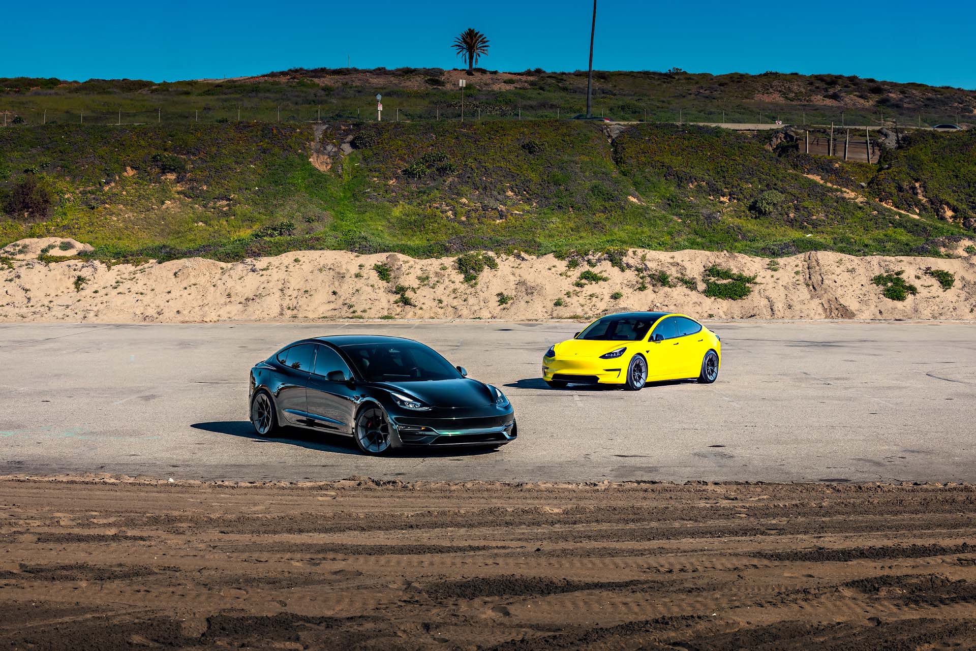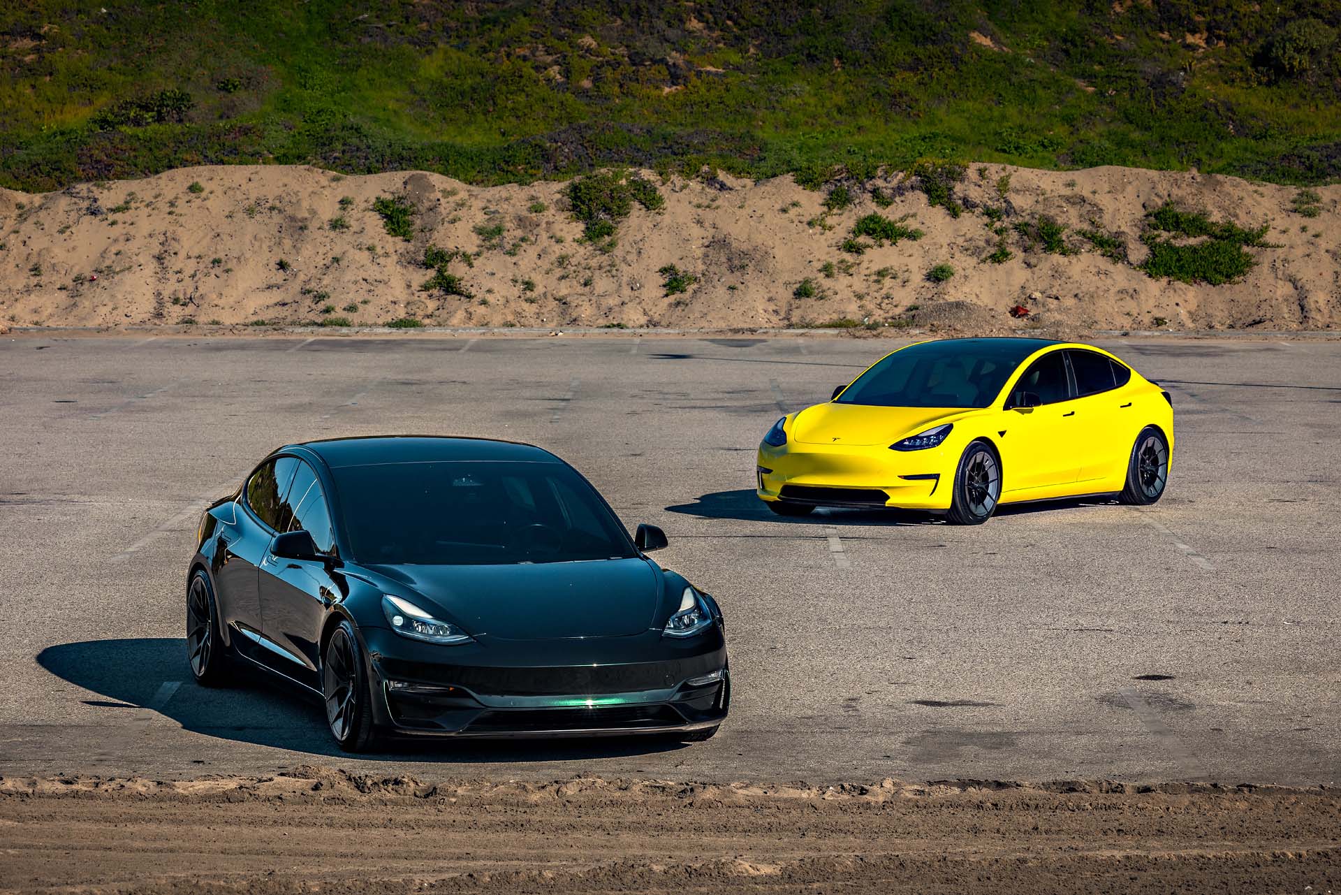 Side By Side with Yellow Wrapped Tesla Model 3