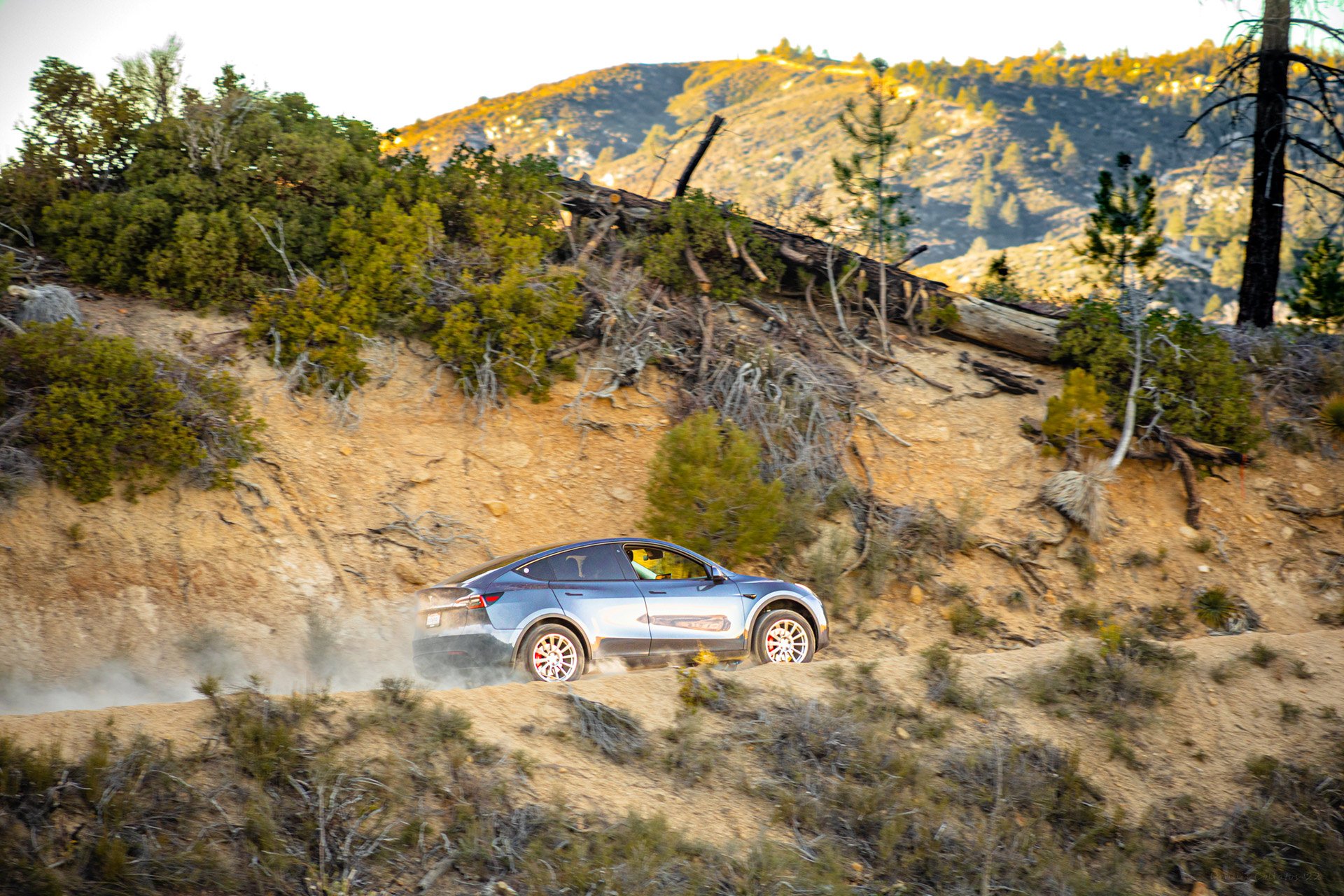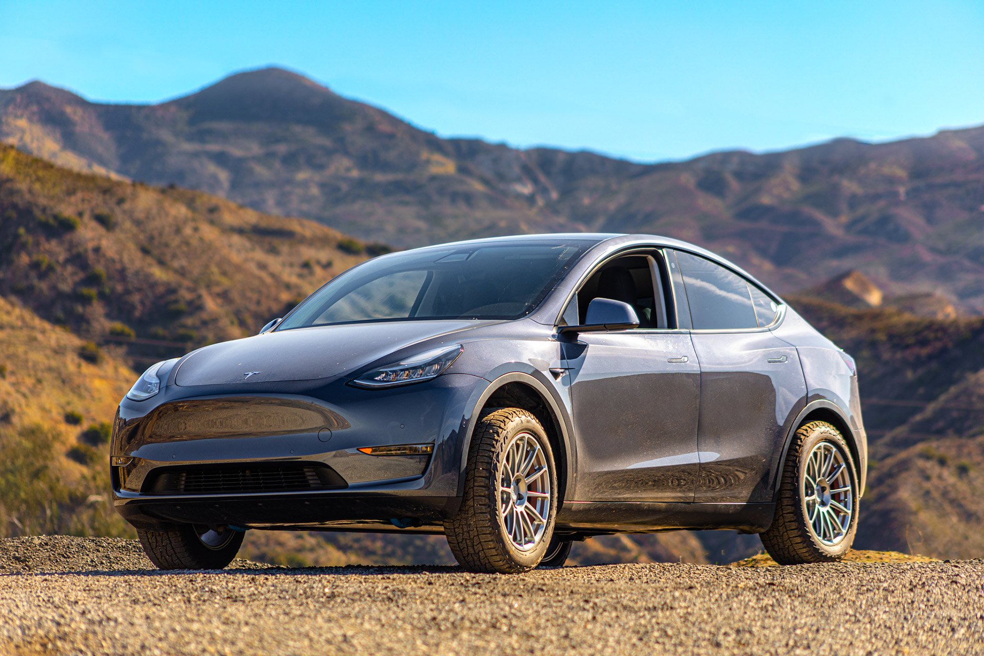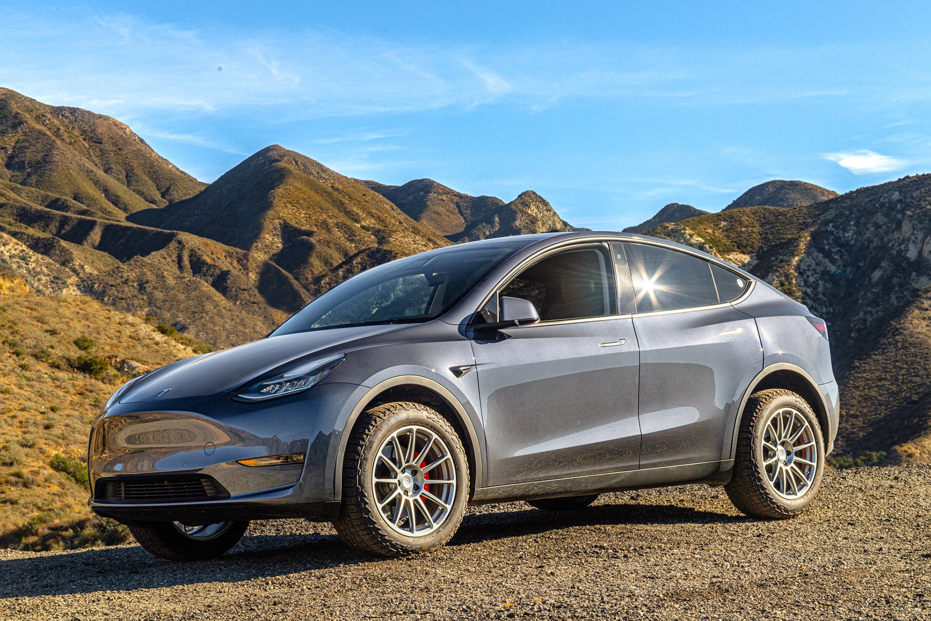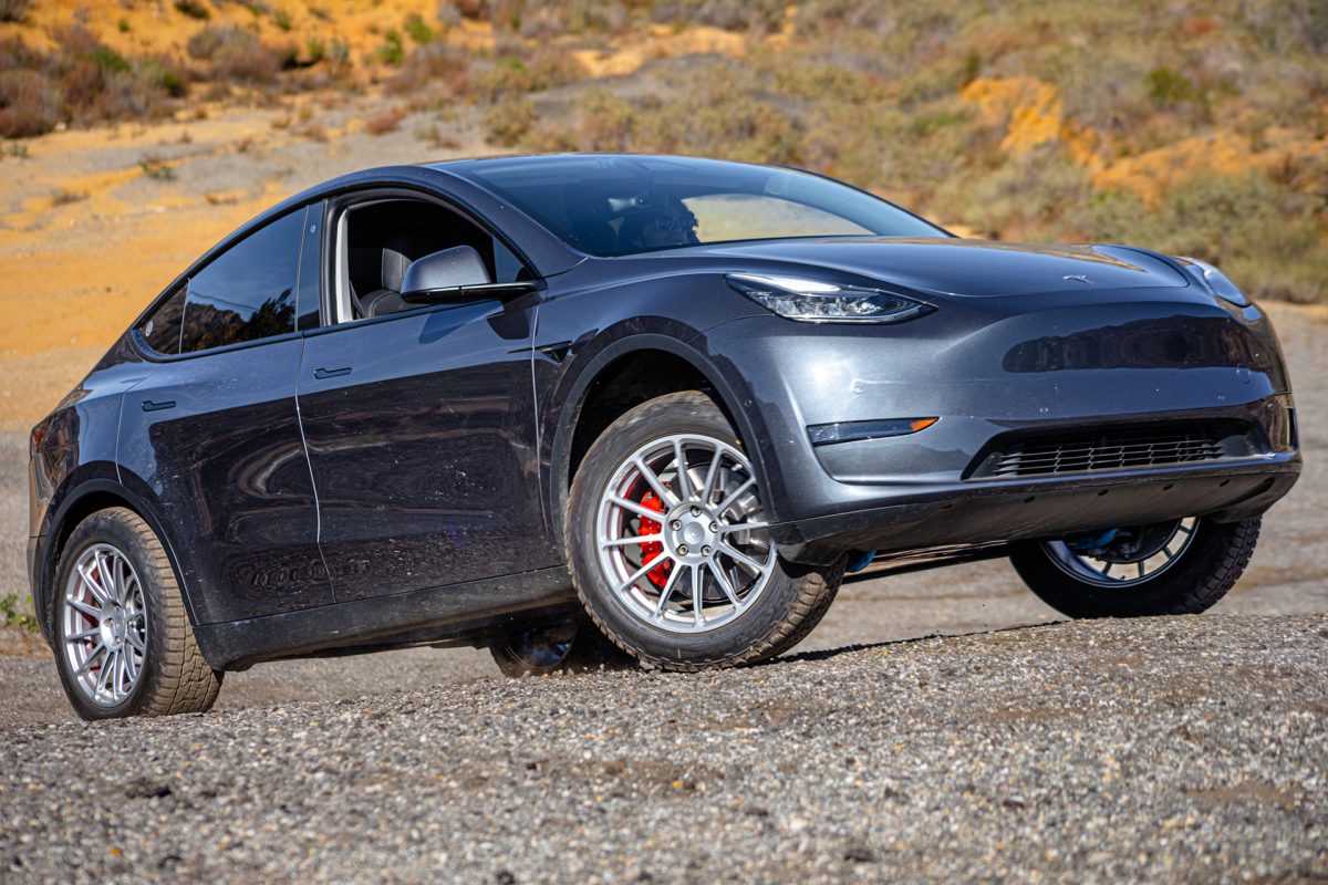 Lifted Tesla Model Y on Dirt and Snow Coilovers