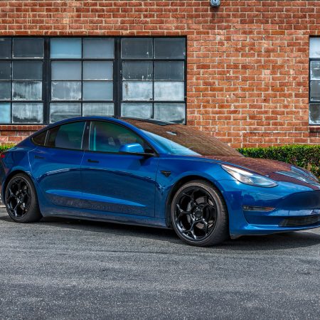 Metallic Blue Tesla Model 3 – UP-05 Forged Wheels In Satin Titanium