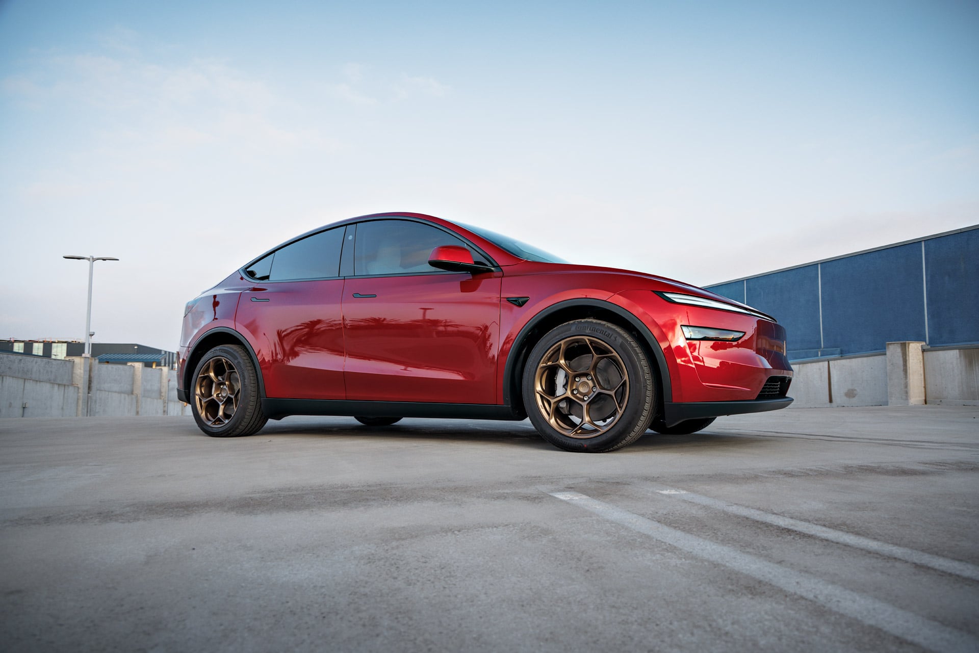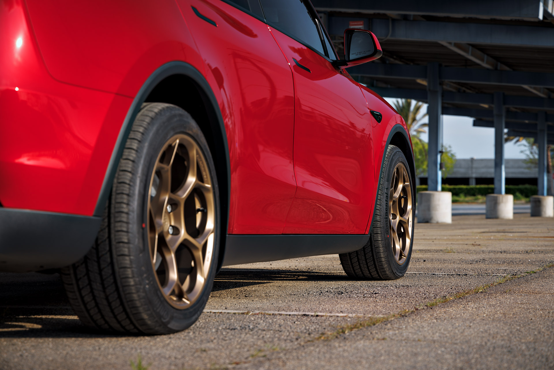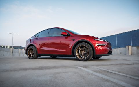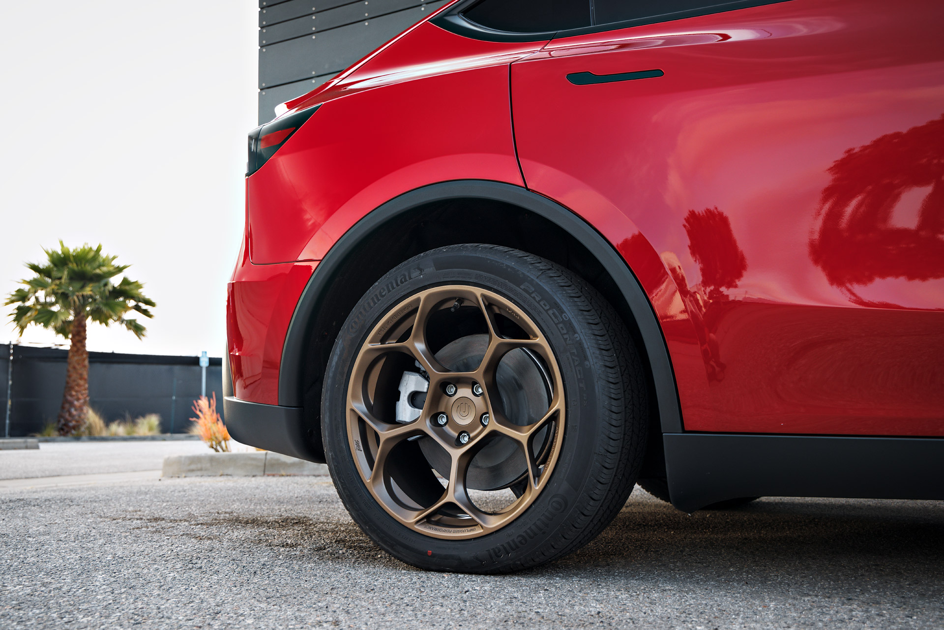 Red 2026 Tesla Model Y Juniper on UP Forged UP-05 in Satin Bronze