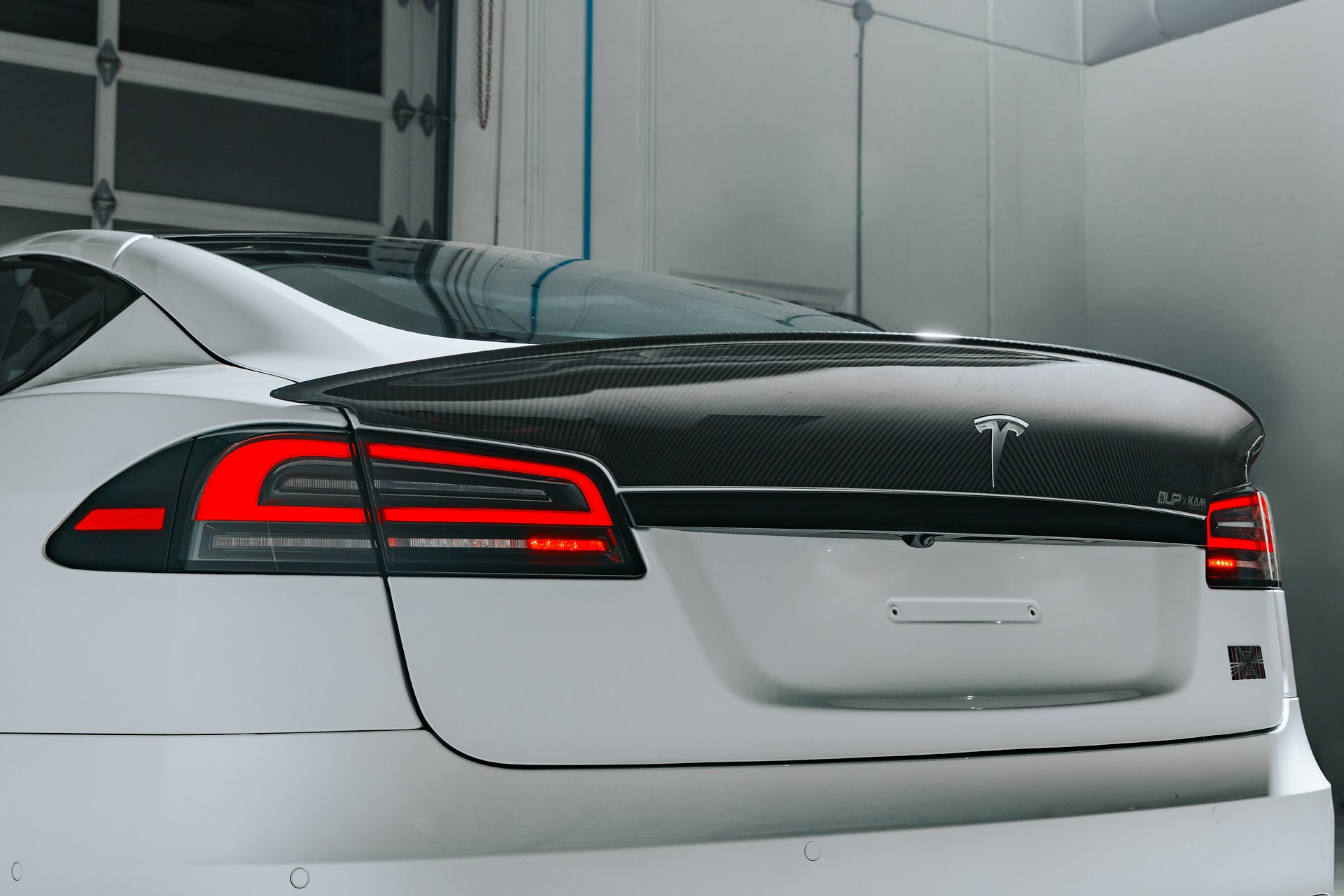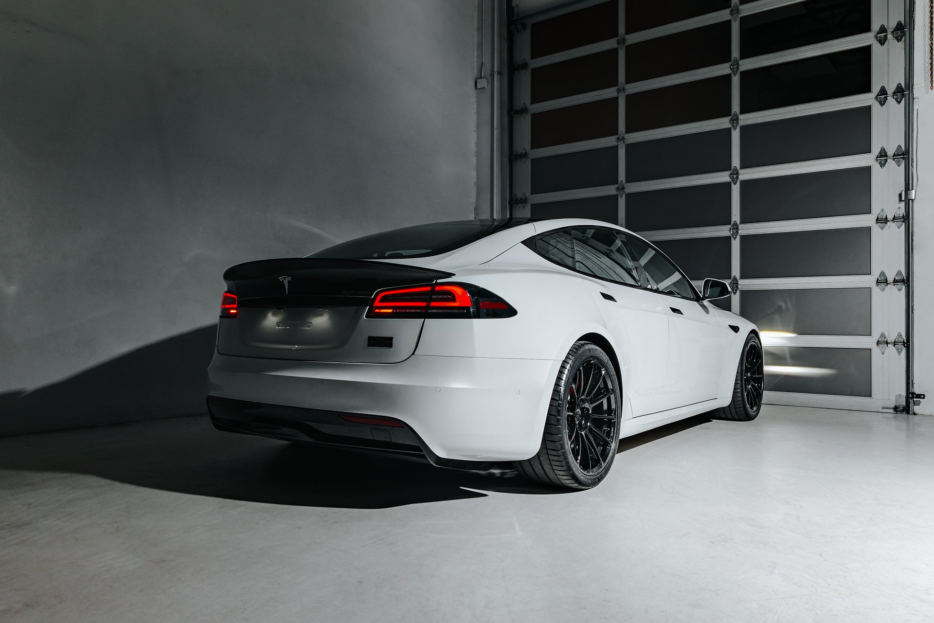 White Tesla Model S Plaid with Koenigsegg Carbon Fiber Spoiler