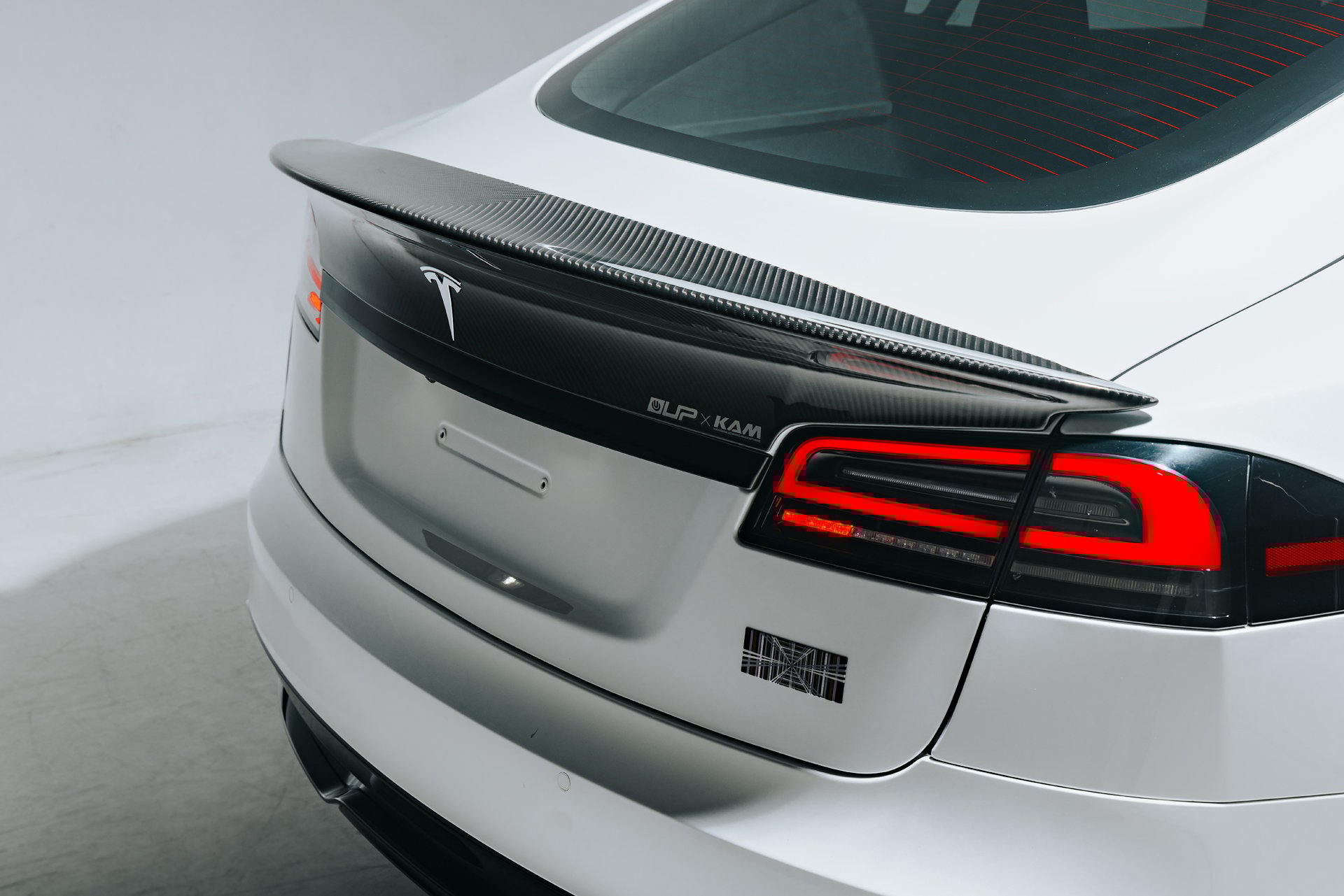 White Tesla Model S Plaid with Koenigsegg Carbon Fiber Spoiler on UP-03 Forged Wheels in Gloss Black