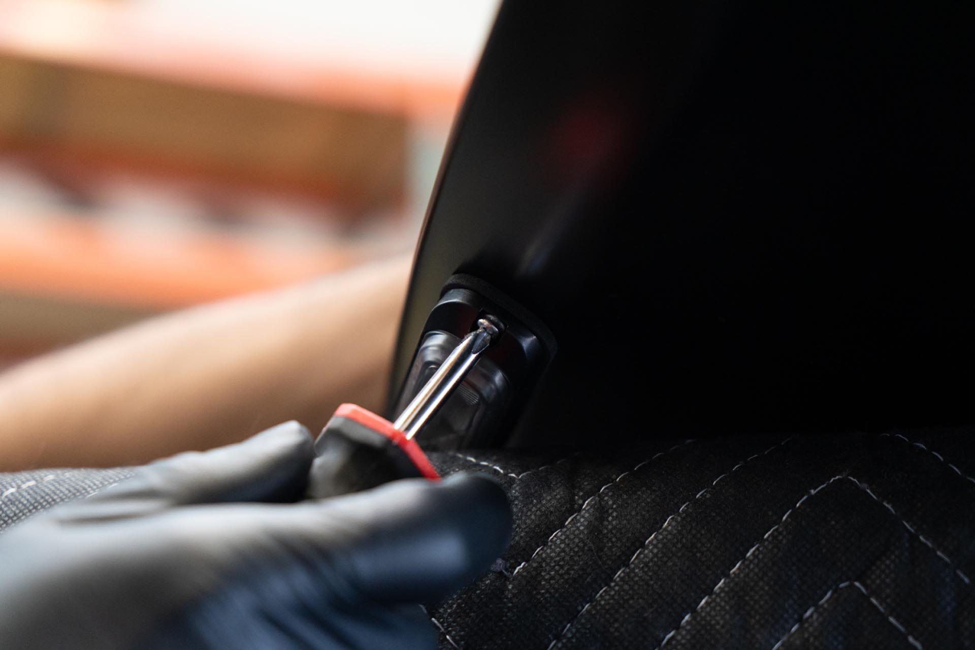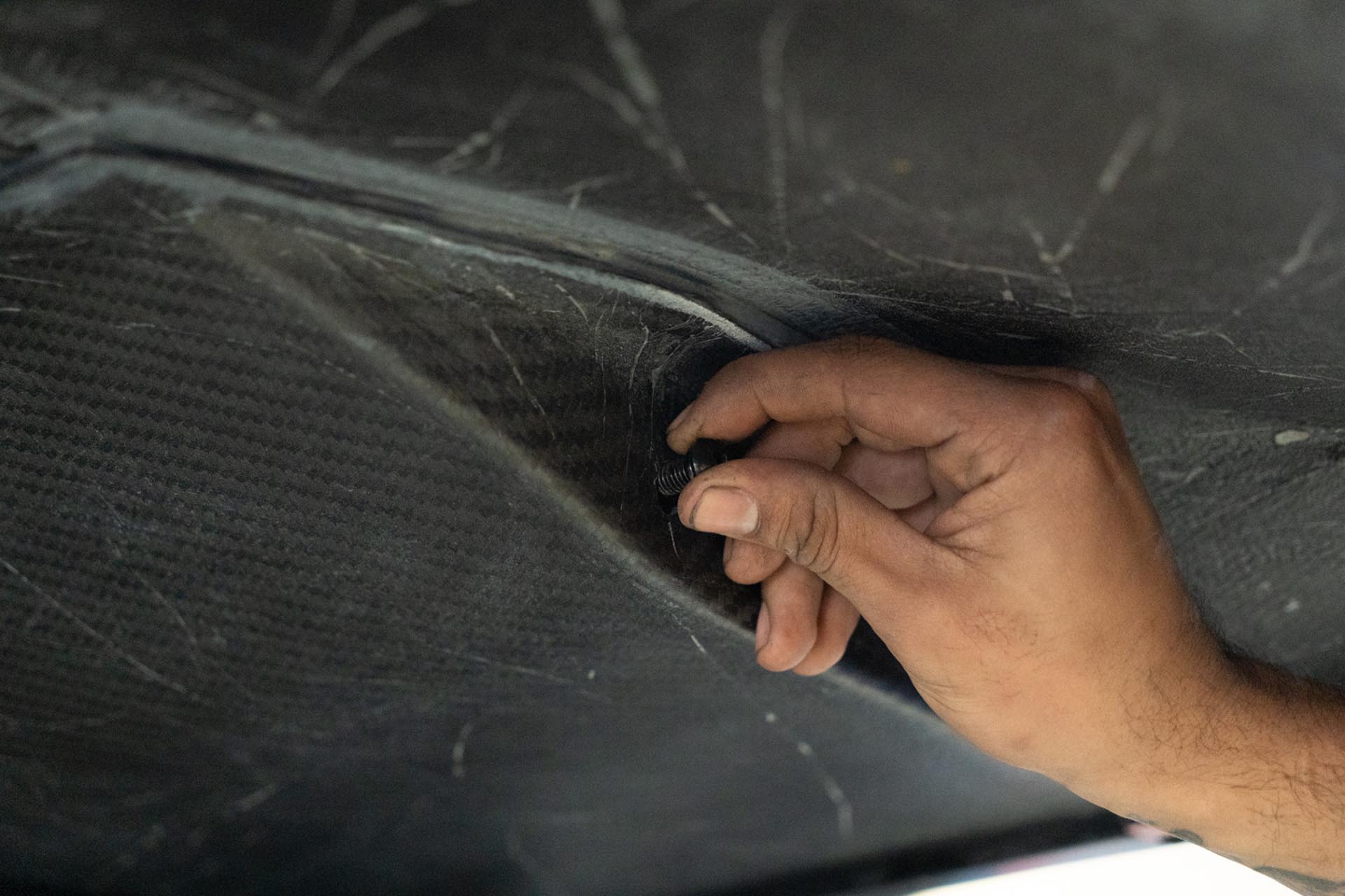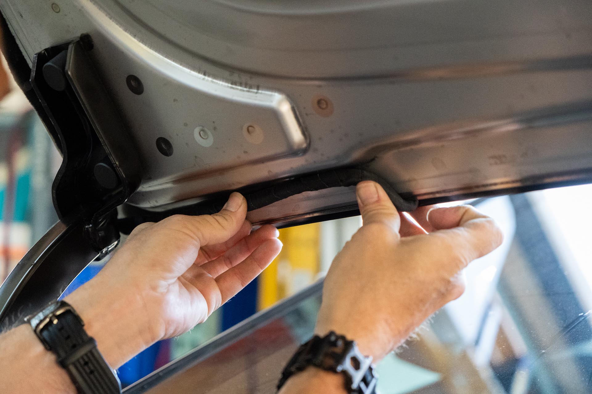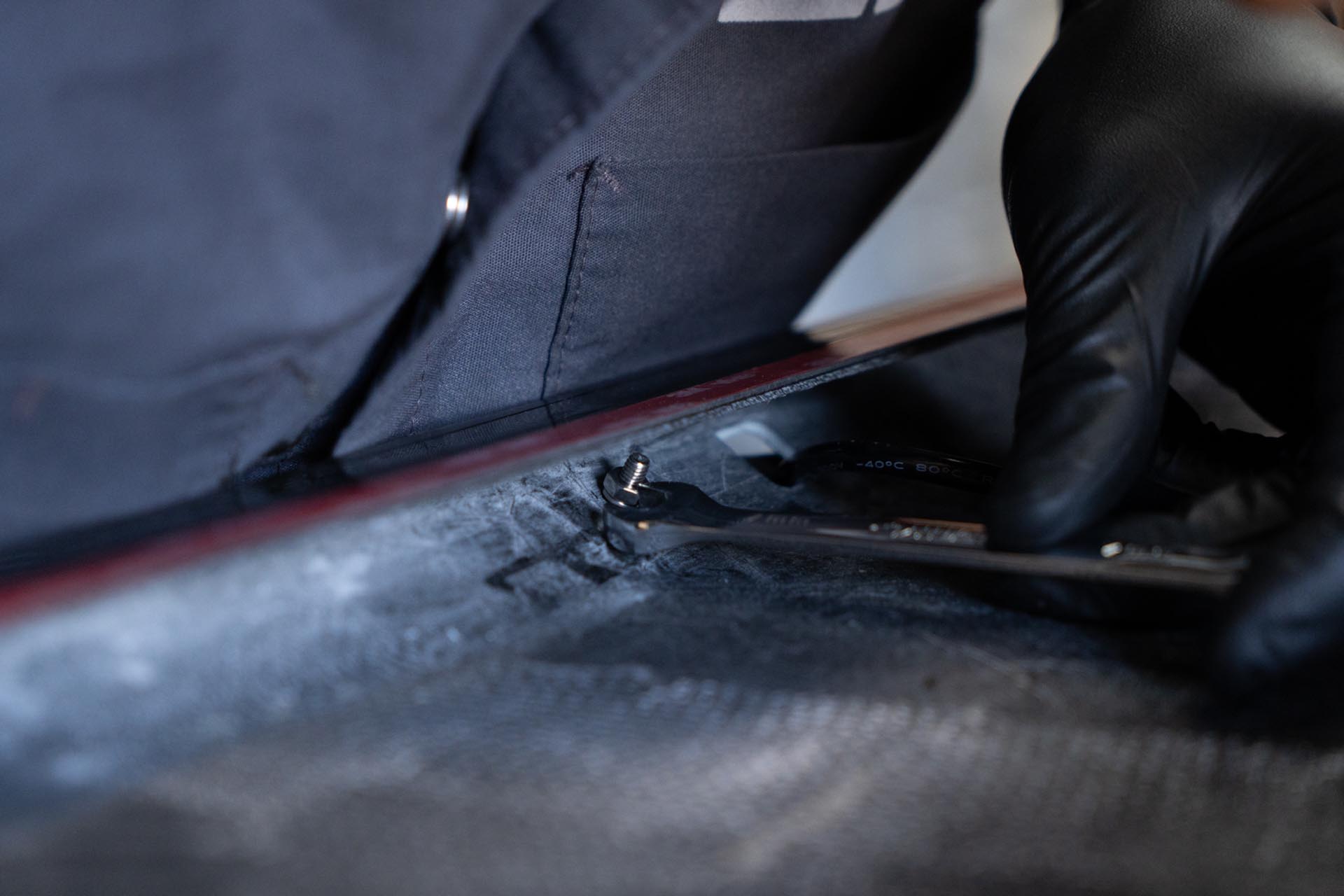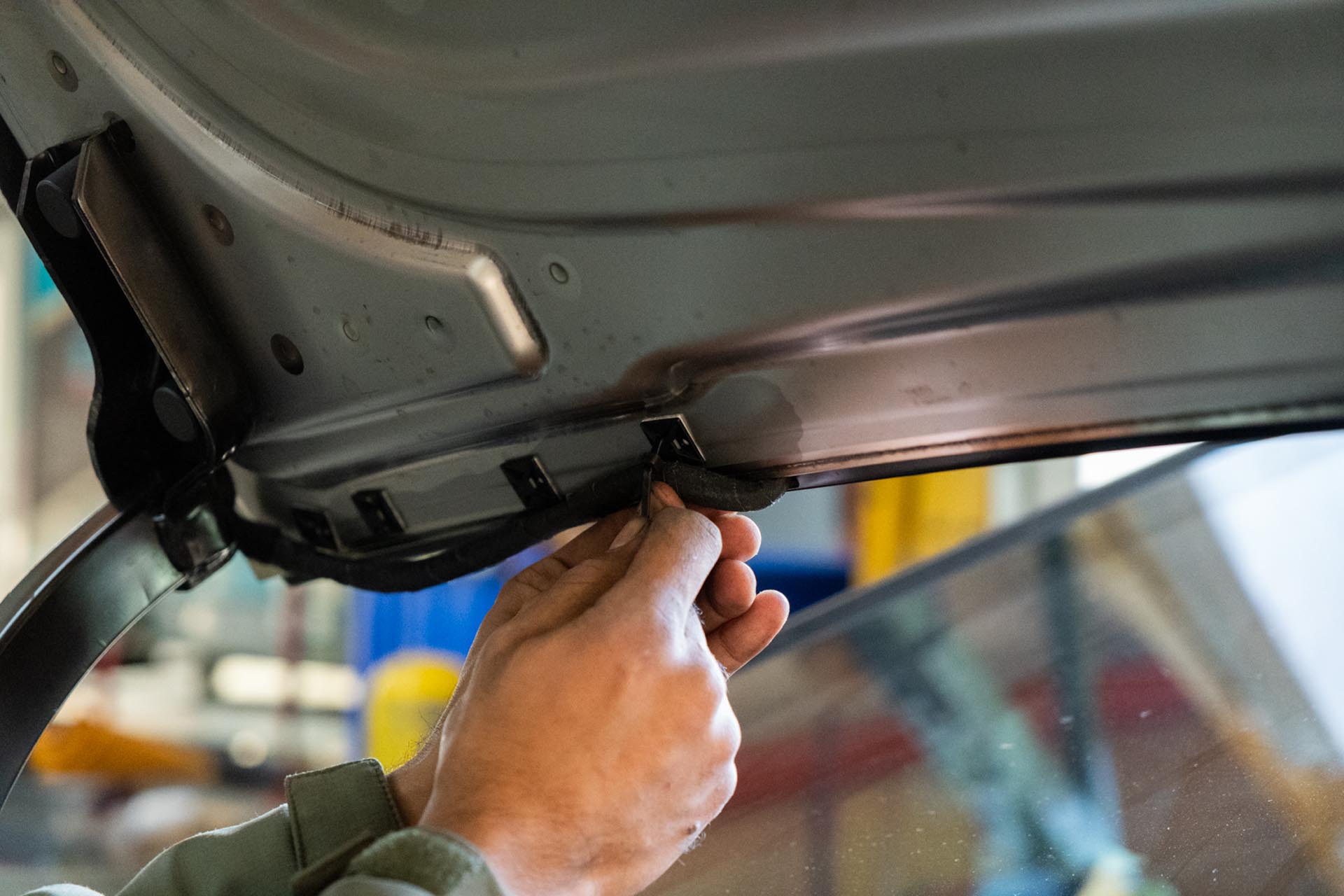 Using the provided adhesive promoter packets, apply adhesive promoter where the adhesive on the UP hood will make contact. We recommend test fitting the UP hood at this stage to understand where adhesive will contact the factory surface.