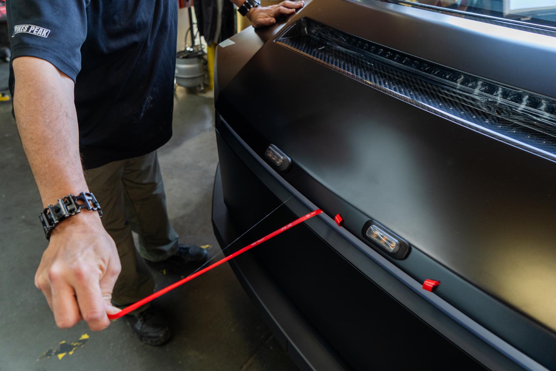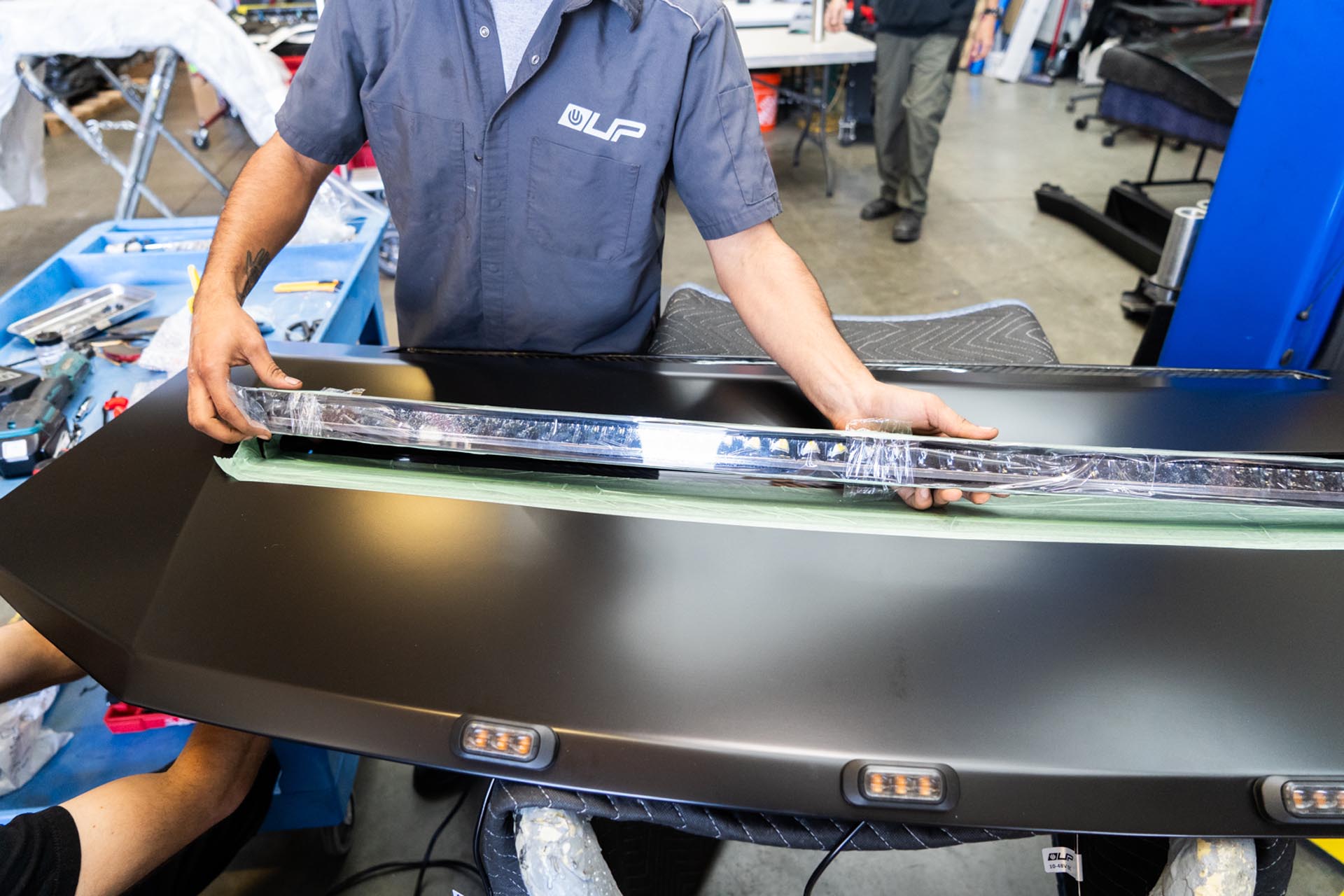 Once the light bar has been fastened to the hood, you can remove the masking tape near the light bar.