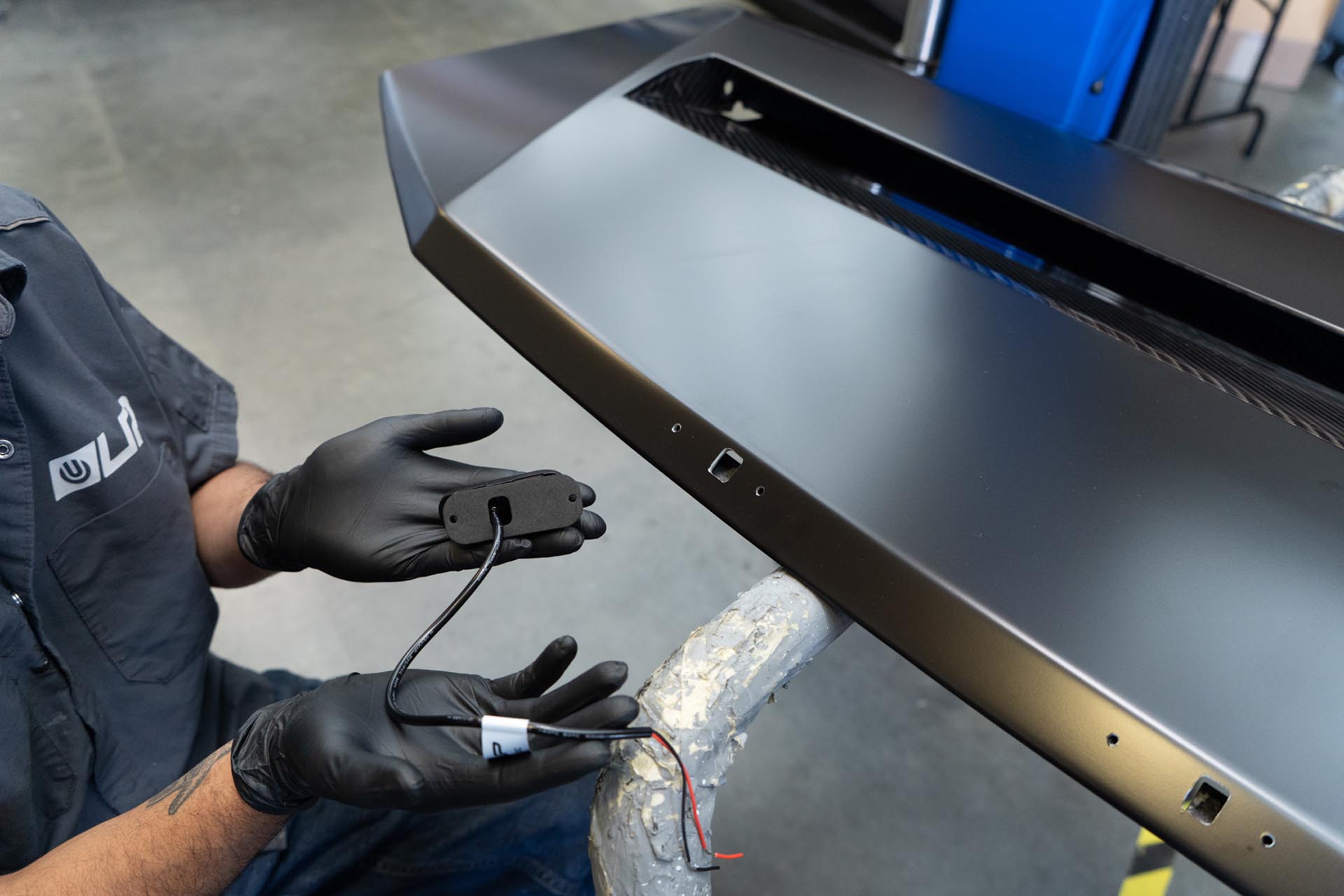 Next, feed the curved light bar power cable through the slot on the passenger side of the hood.