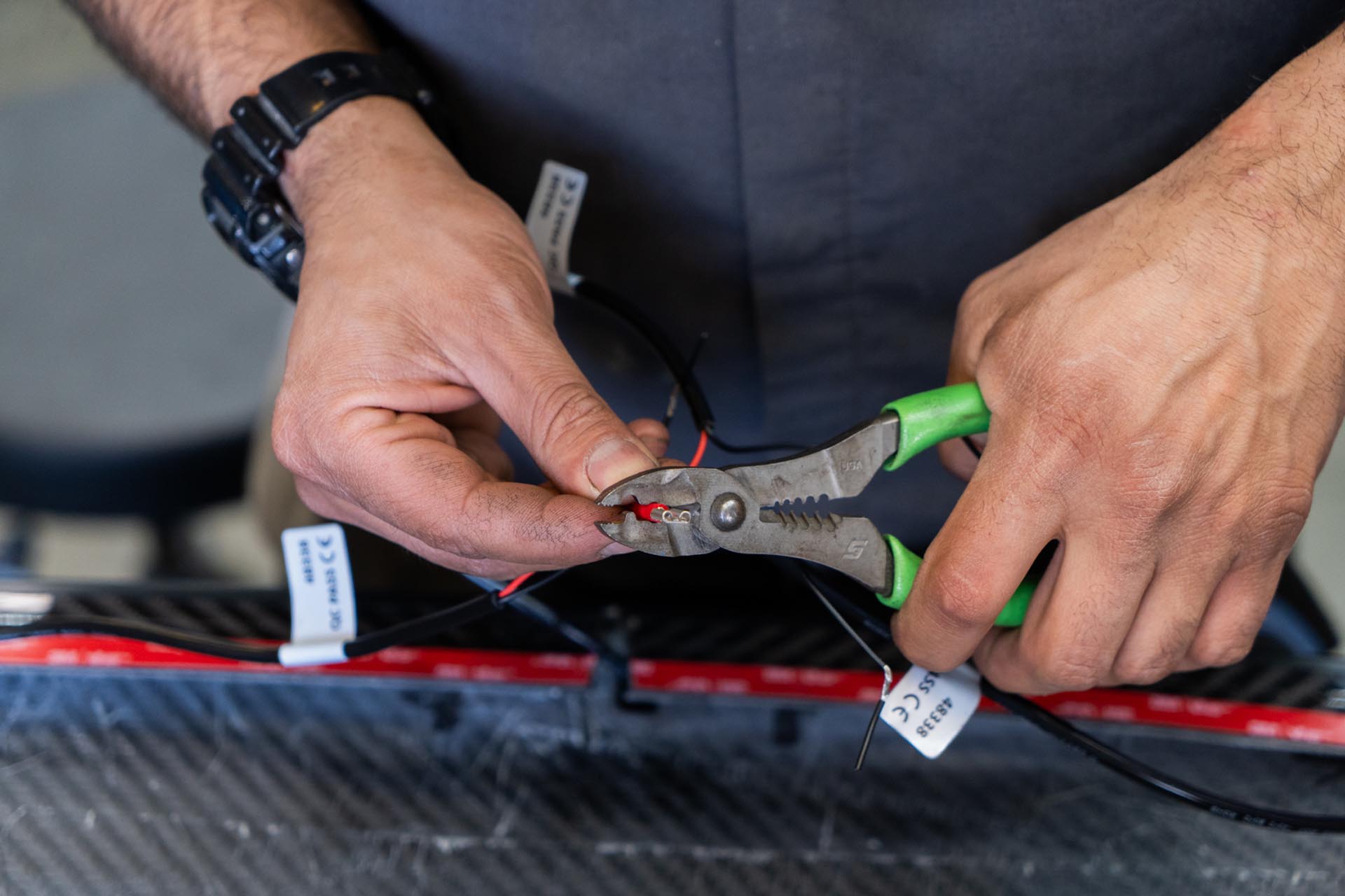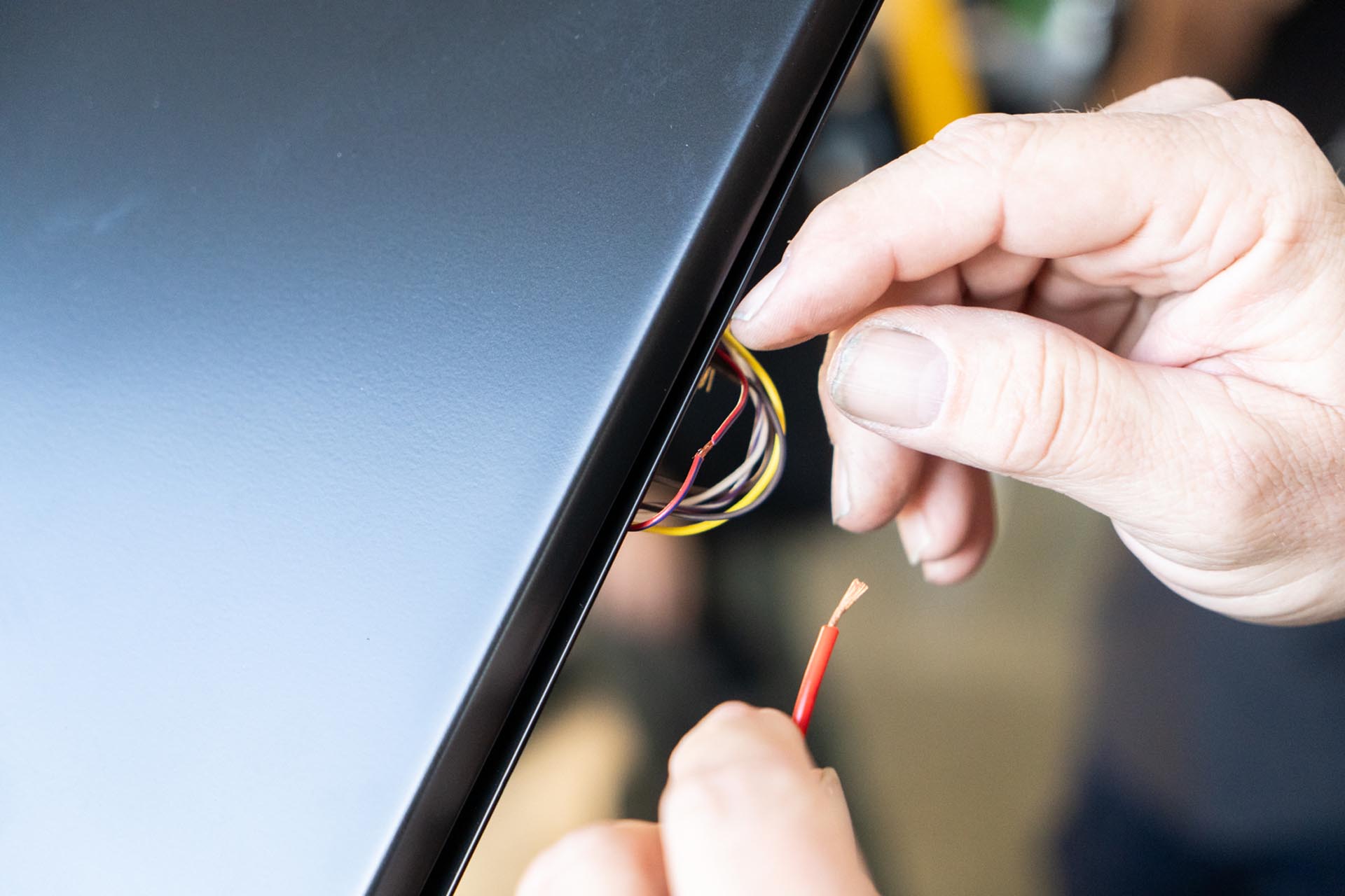 Using a set of wire strippers, expose the lead ends of the amber light power cables.
