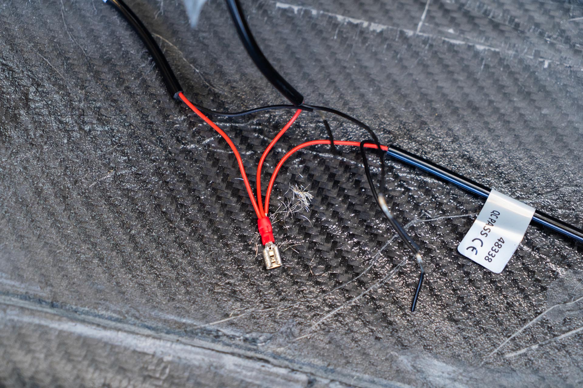 With the tub assembly removed from the vehicle, locate the following front power feed, often wrapped in blue tape from the factory.