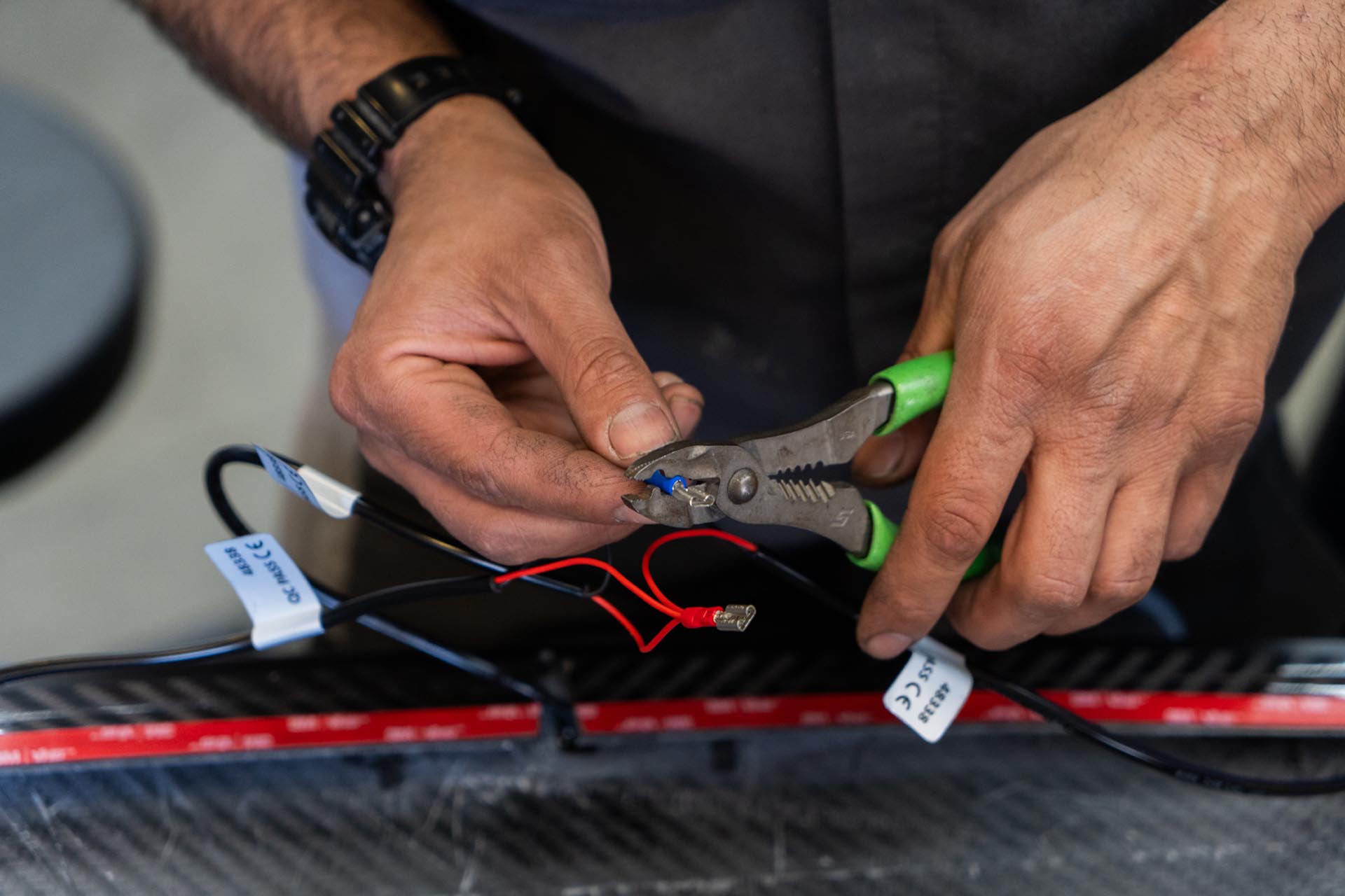 Using a set of wire strippers and a crimp, connect all of the positive lead ends together. You can also soldier the wires instead, however we are using crimps for general serviceability. (crimps not included).