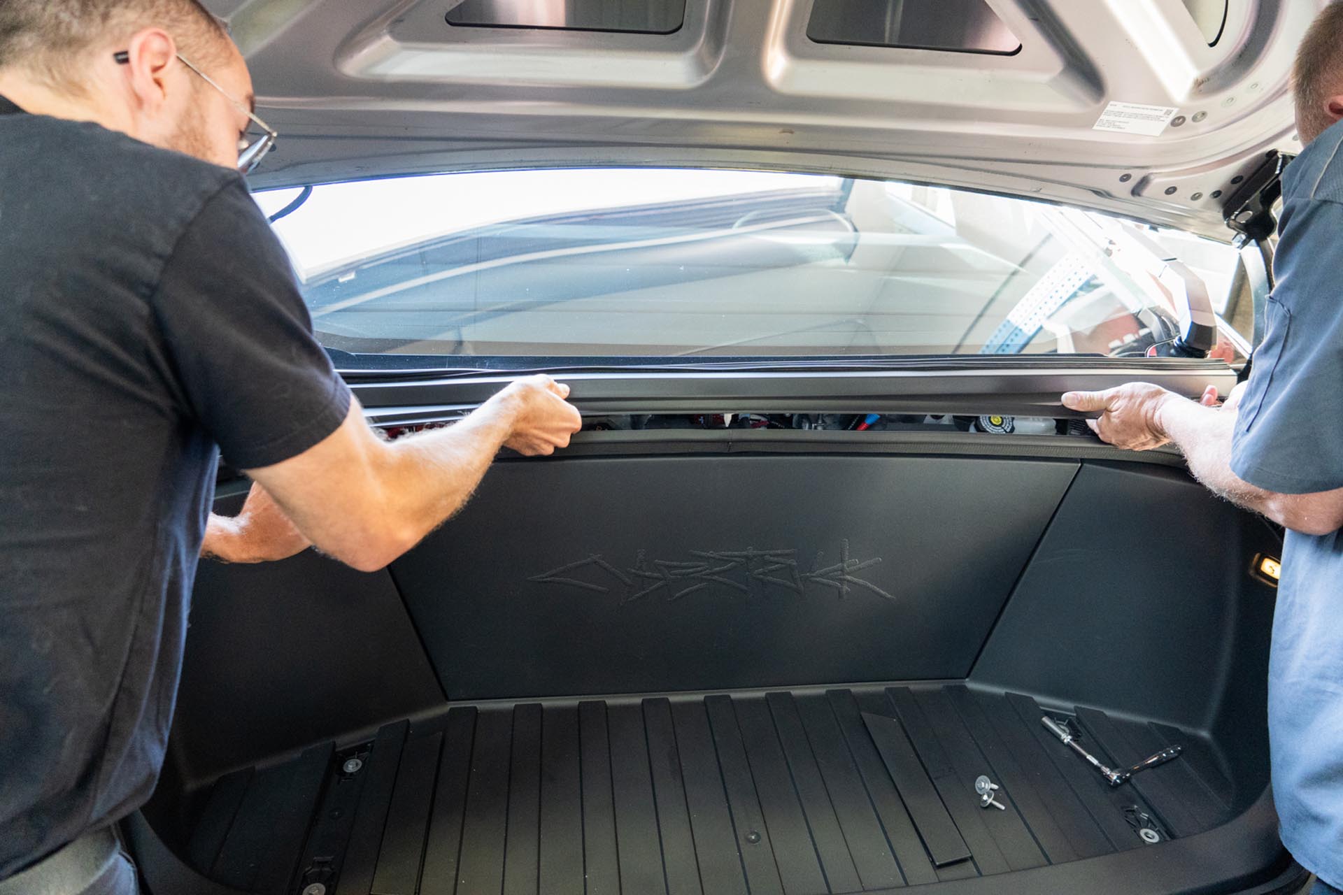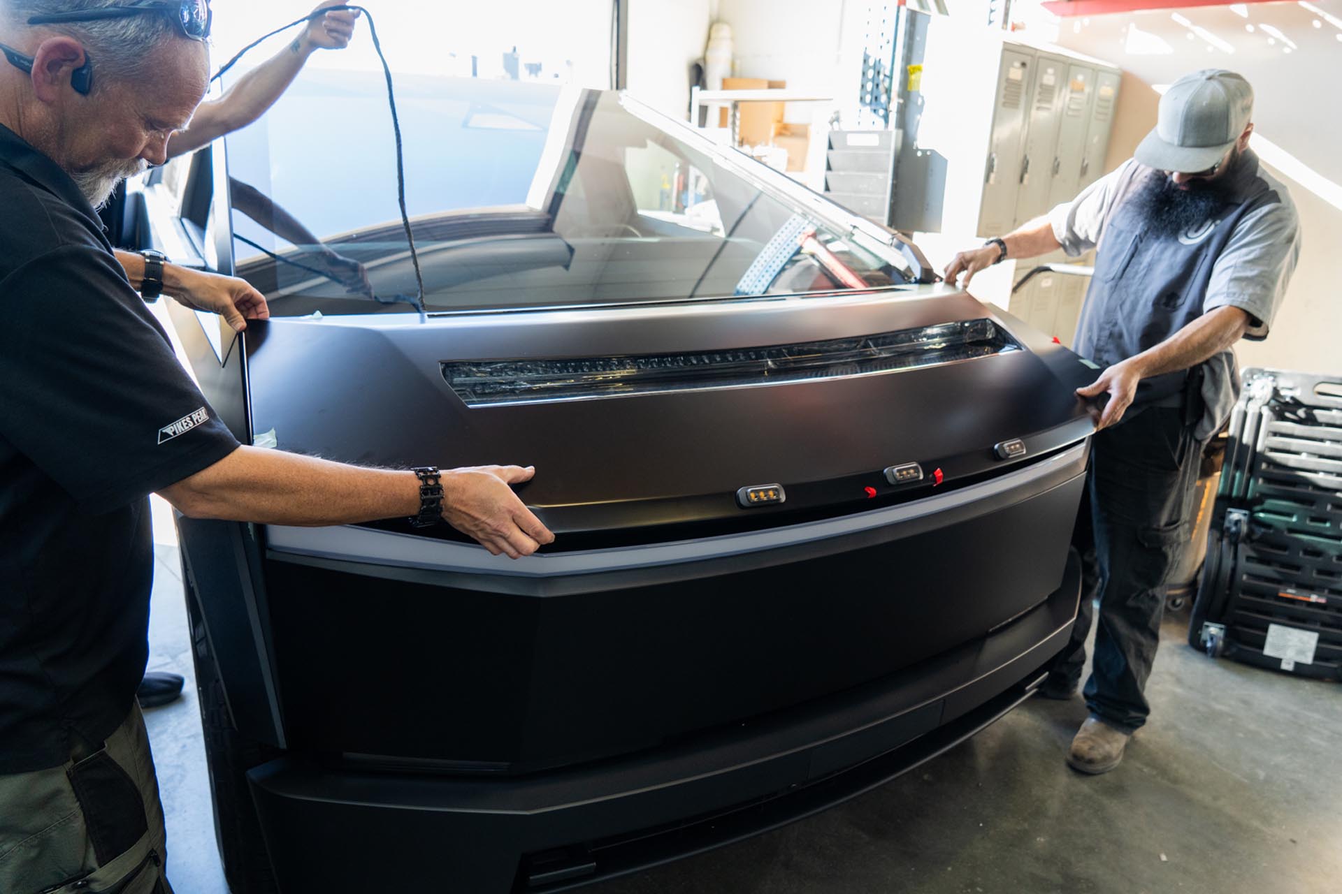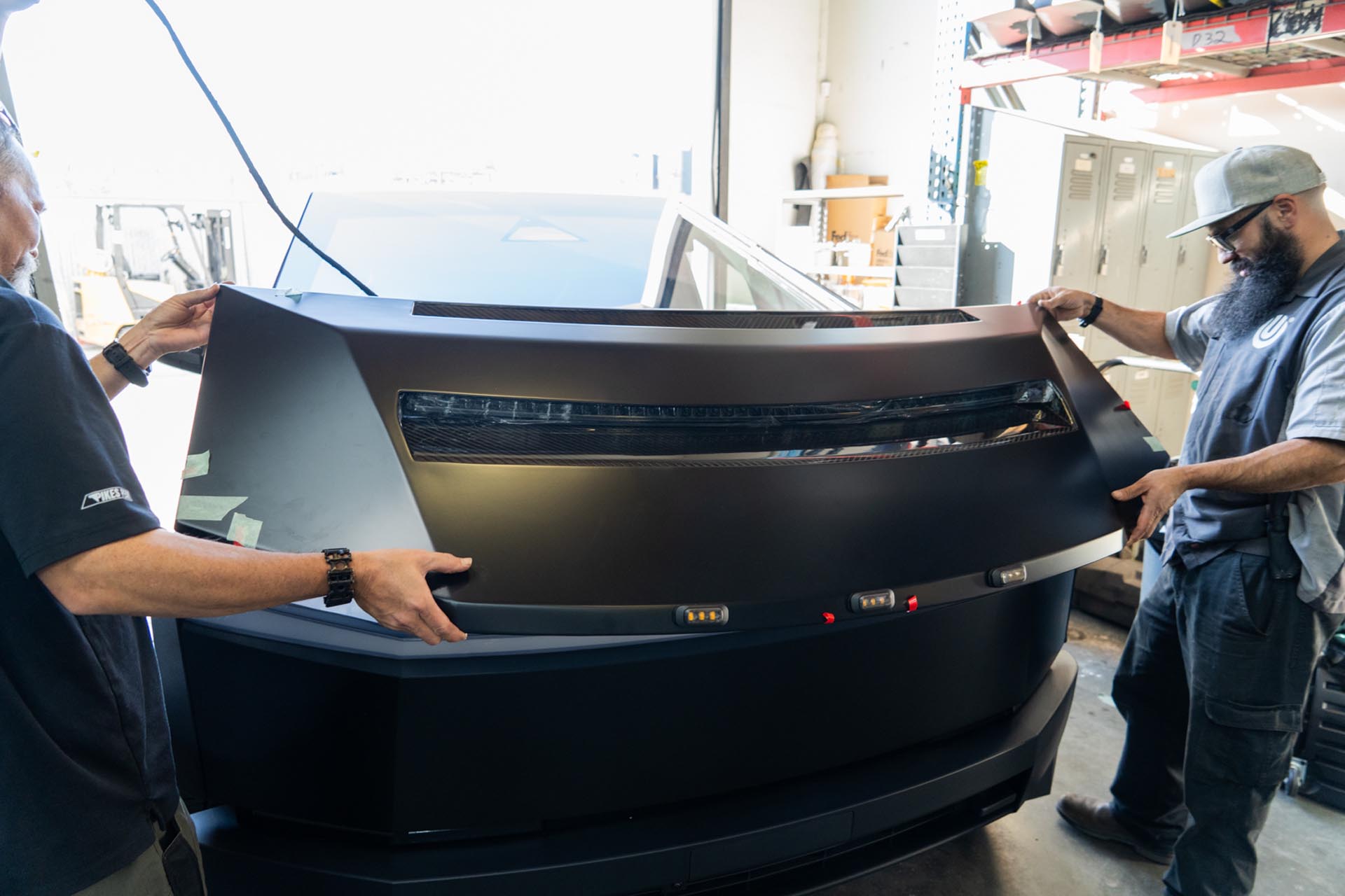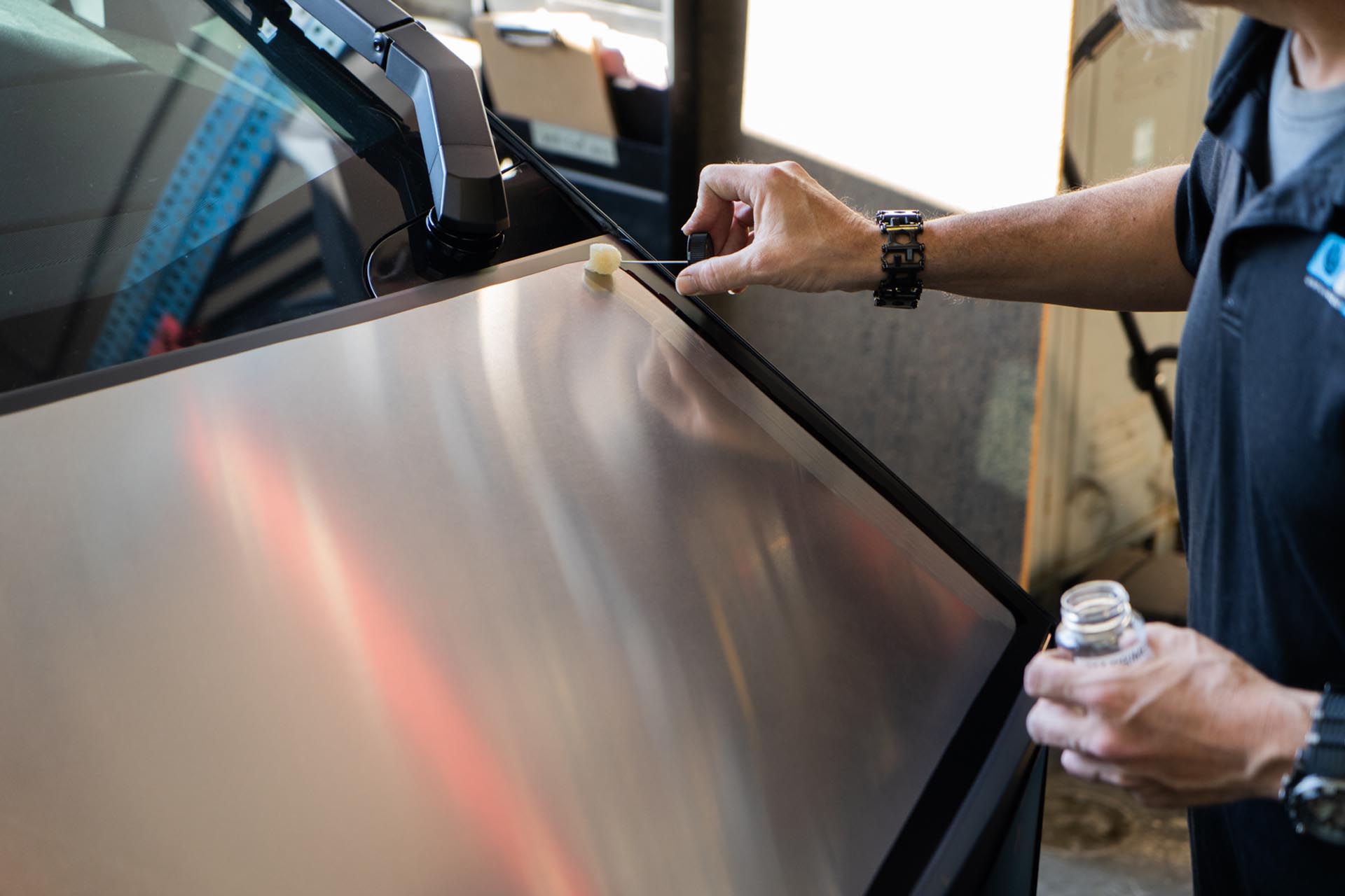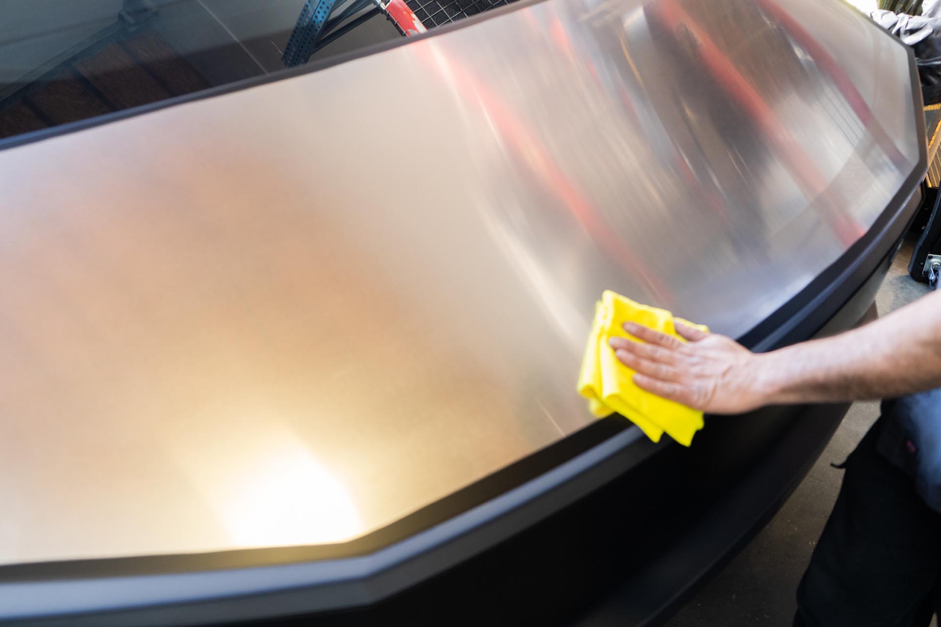 Be sure to prep the surface of the factory hood on your Cybertruck to ensure that a proper adhesive bond can form upon installation. Any PPF or ceramic coatings may hinder the adhesive’s ability to support the weight of the hood. In the example below, film over the factory surface has been removed where the adhesive bond will secure the hood to the vehicle.