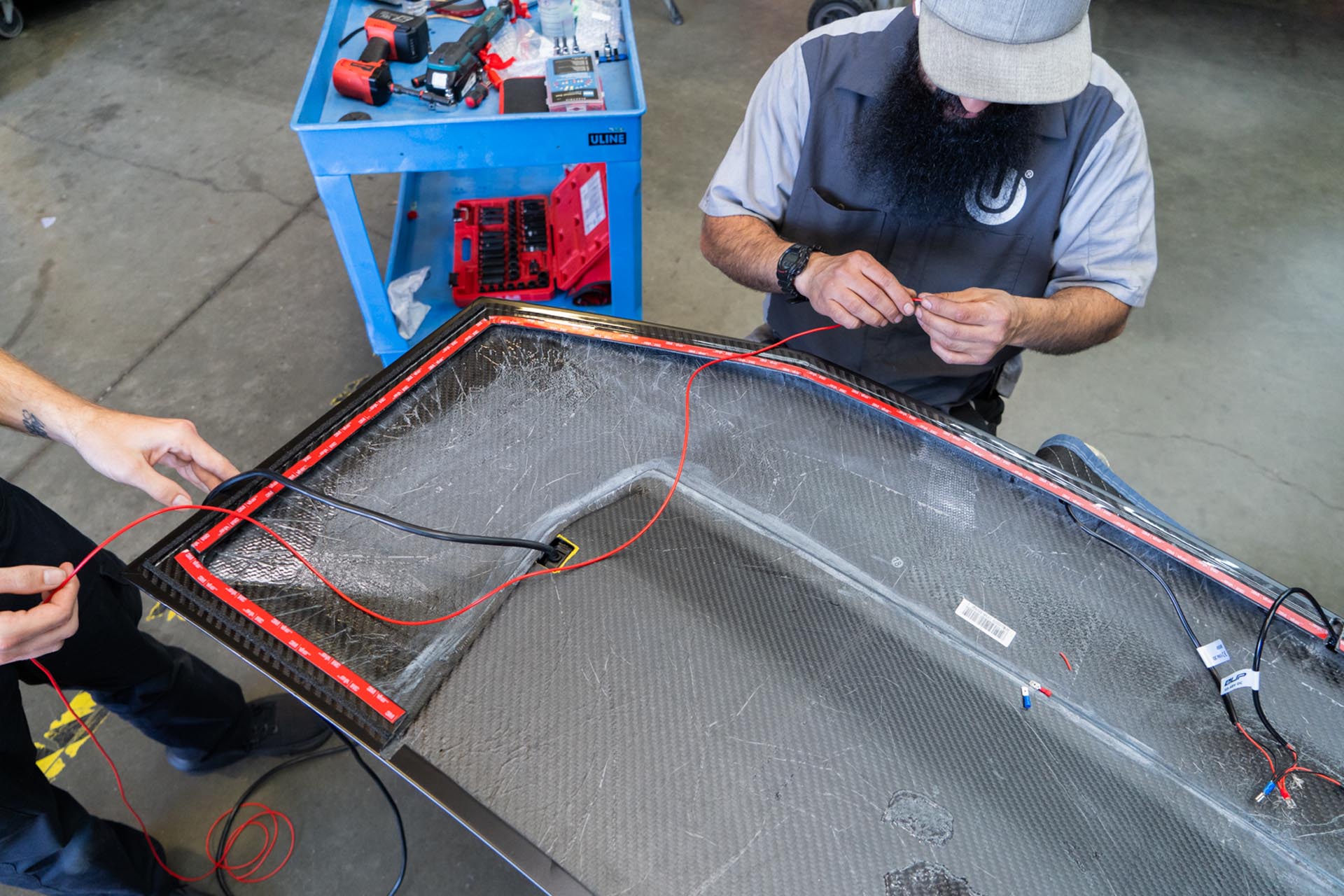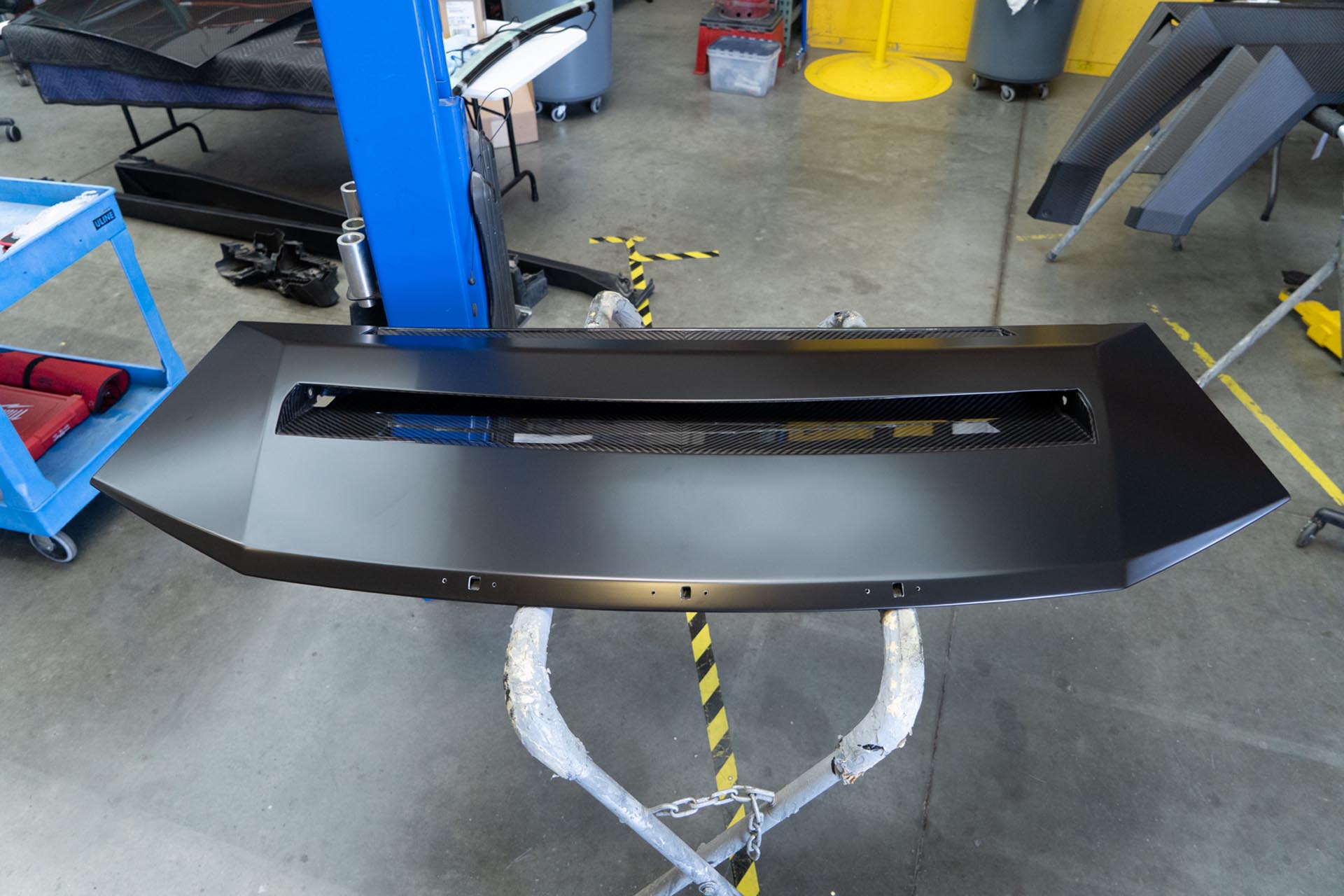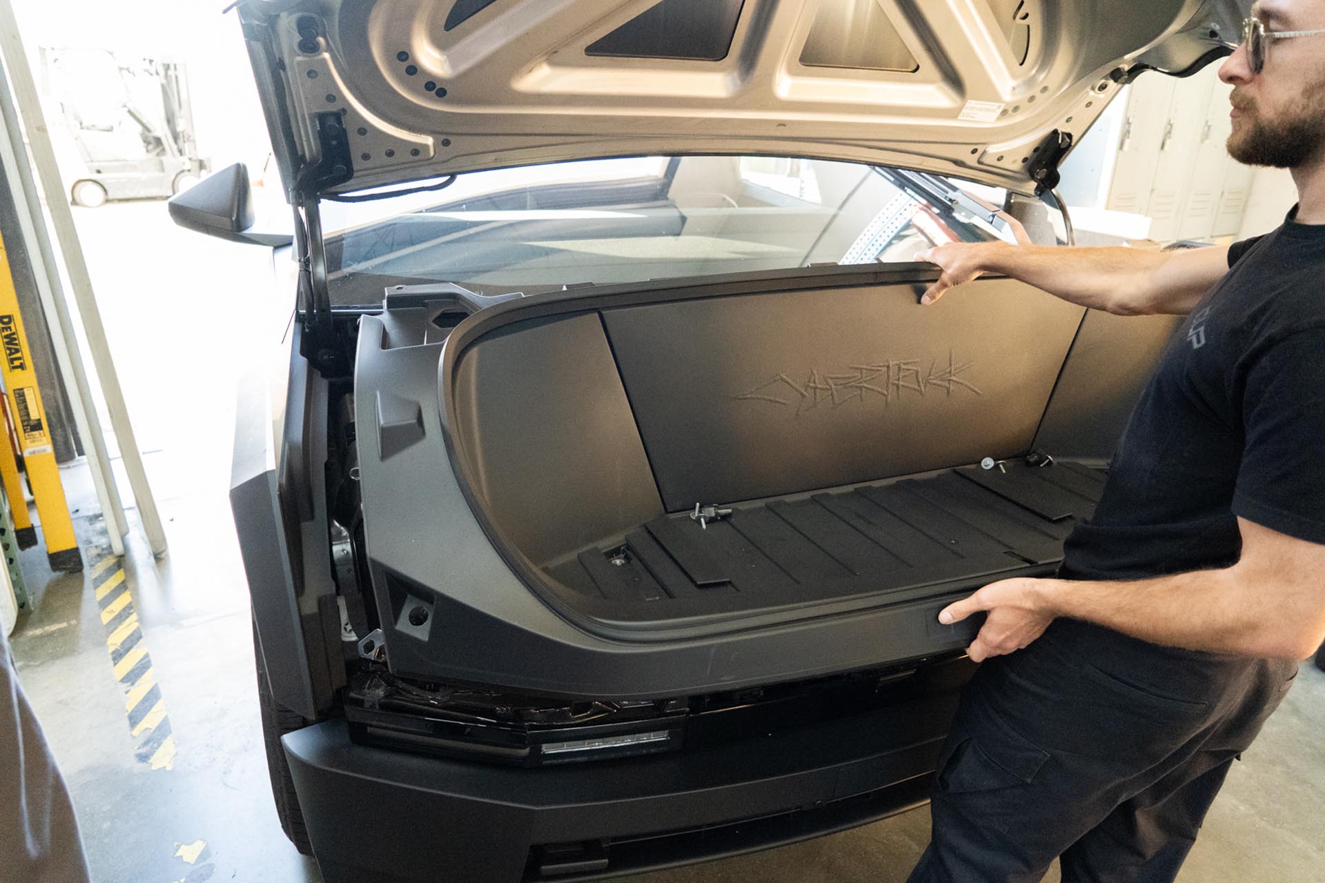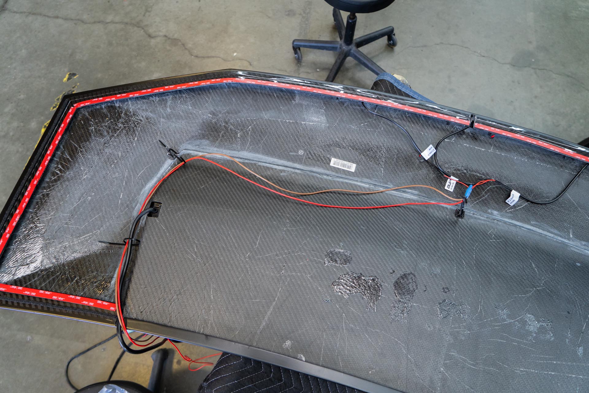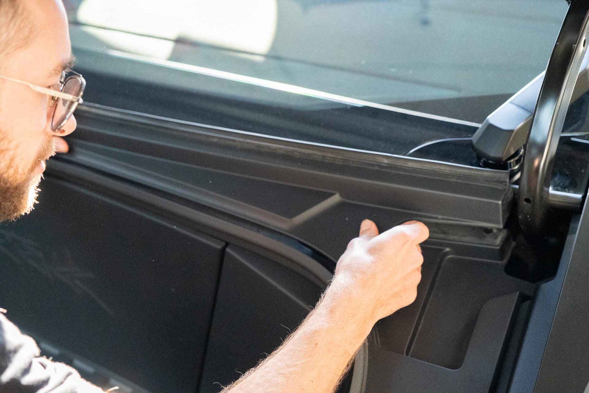 Be sure to prep the surface of the factory hood on your Cybertruck to ensure that a proper adhesive bond can form upon installation. Any PPF or ceramic coatings may hinder the adhesive’s ability to support the weight of the hood. In the example below, film over the factory surface has been removed where the adhesive bond will secure the hood to the vehicle.