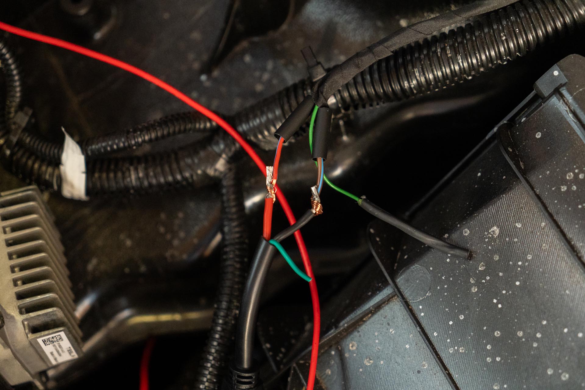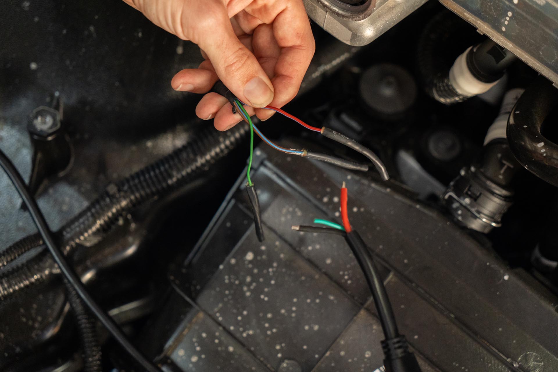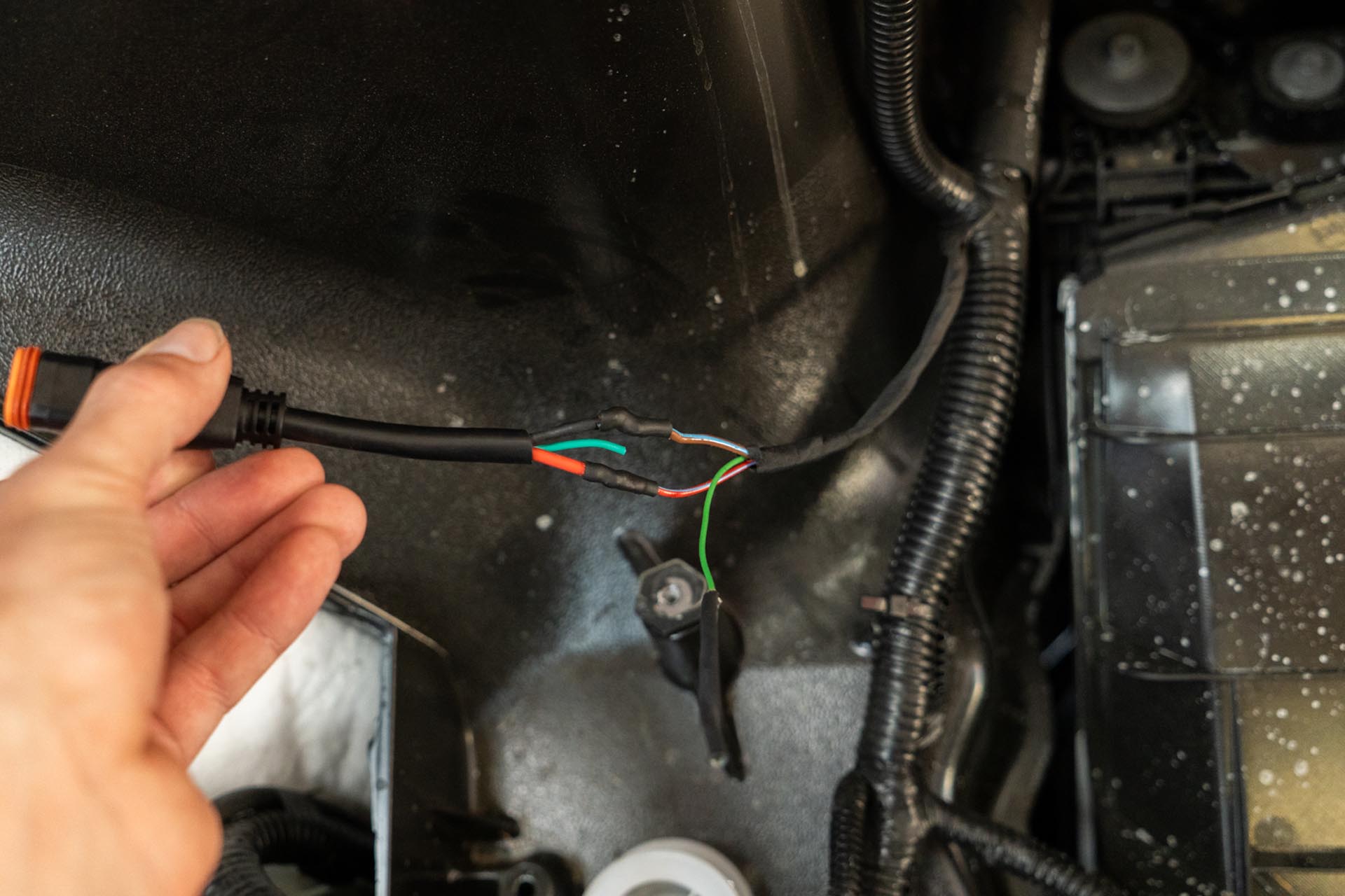 Should you choose to proceed, route your amber lead cables to tether to the factory DRL power feed. Be sure to route the cabe in a way where it is not impacted by the range of motion of the hood, nor pinched by the hood hinge.