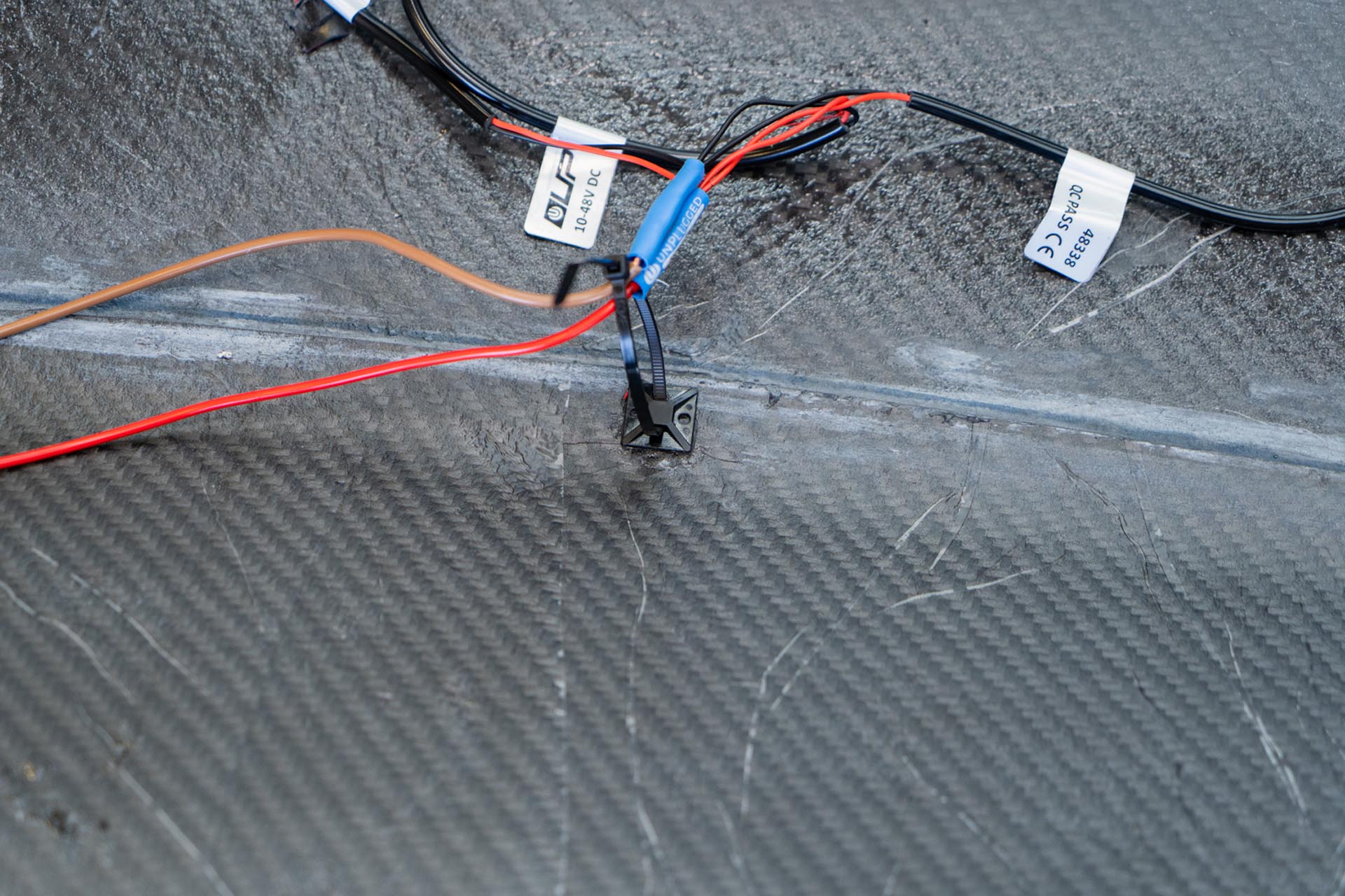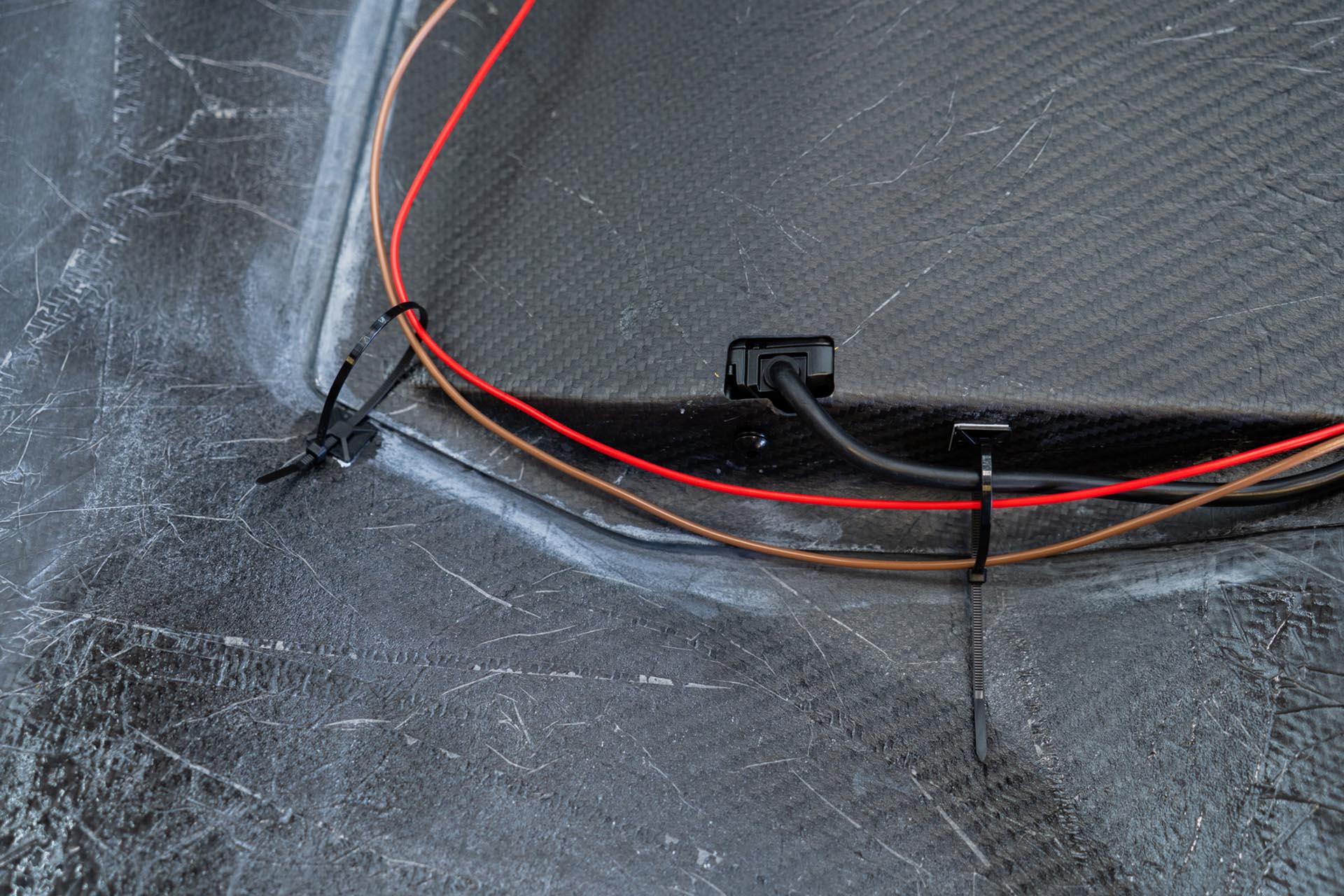 Next, using generic cable routing tie offs, secure the lead ends to the underside of the hood as shown below, with a goal of minimizing slack. (generic tie off’s not included).