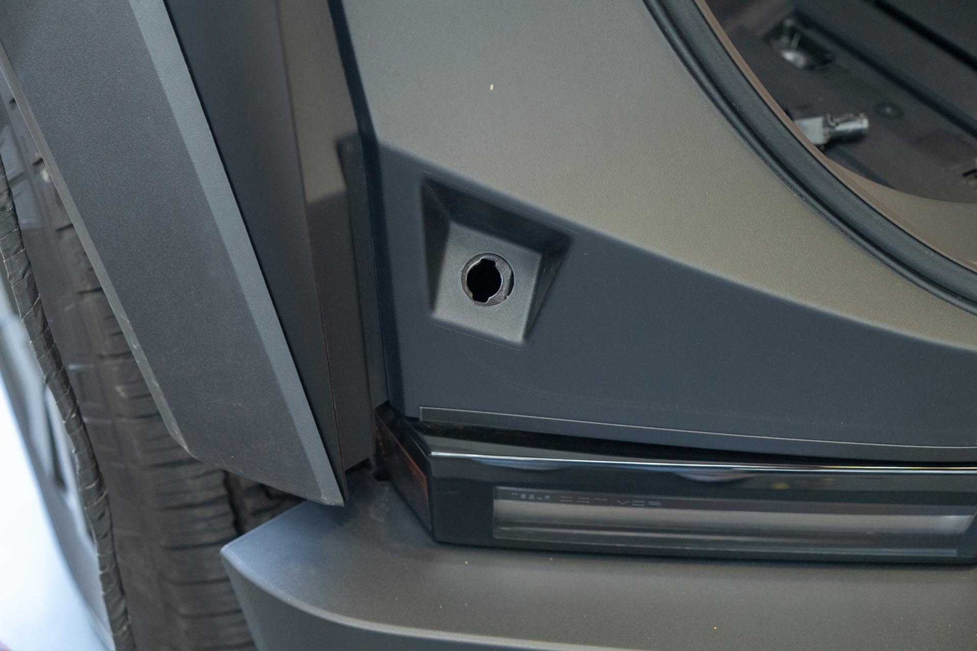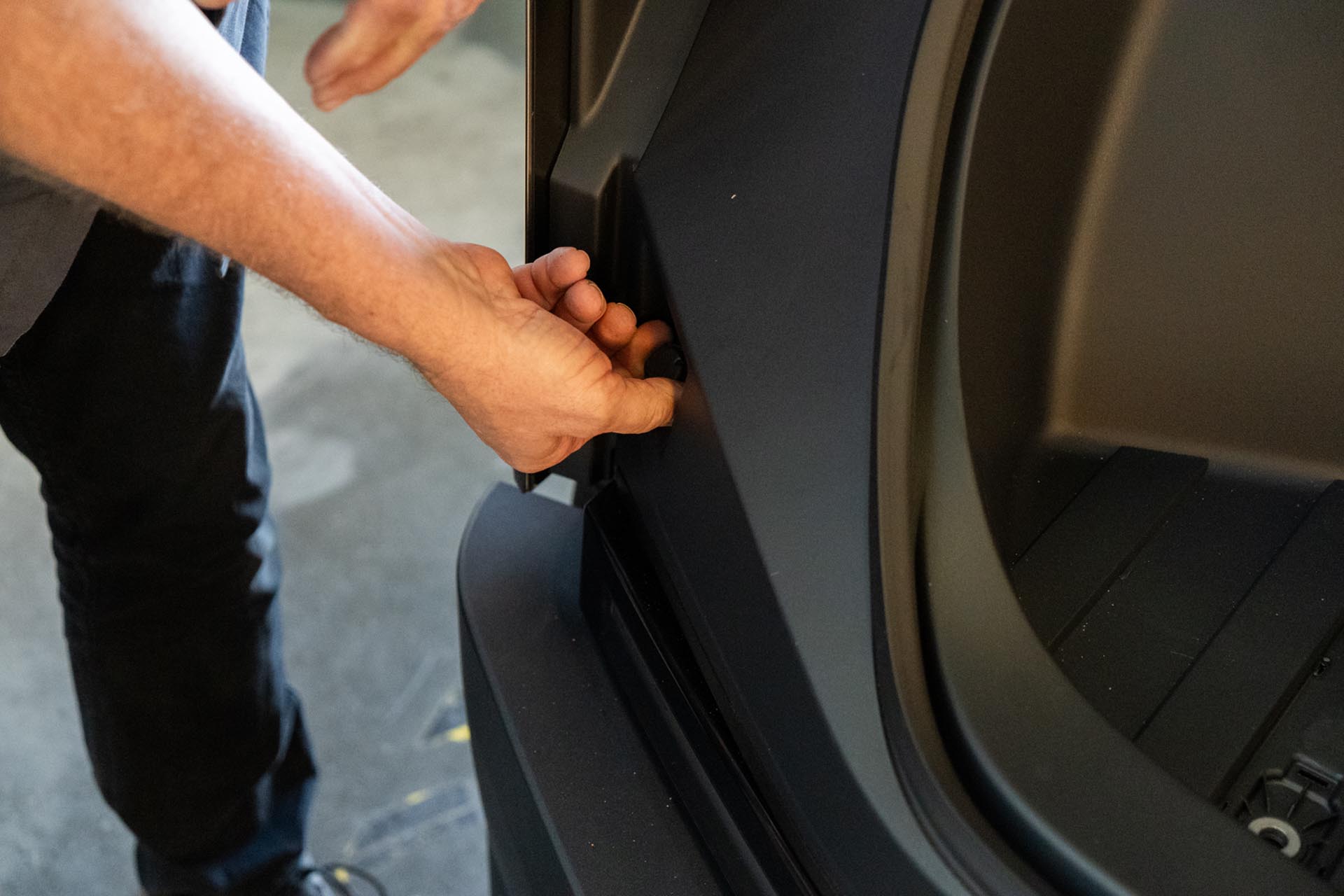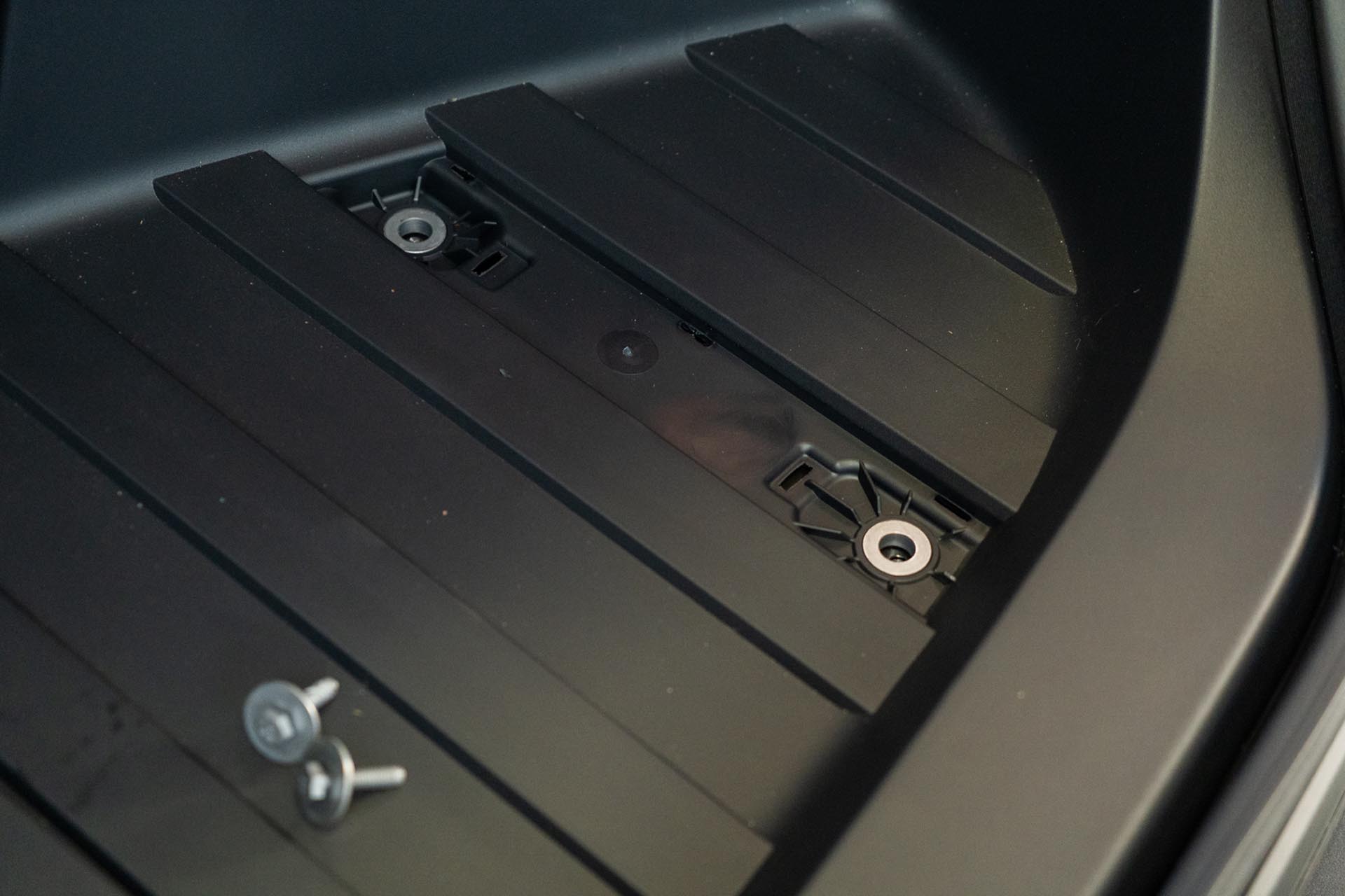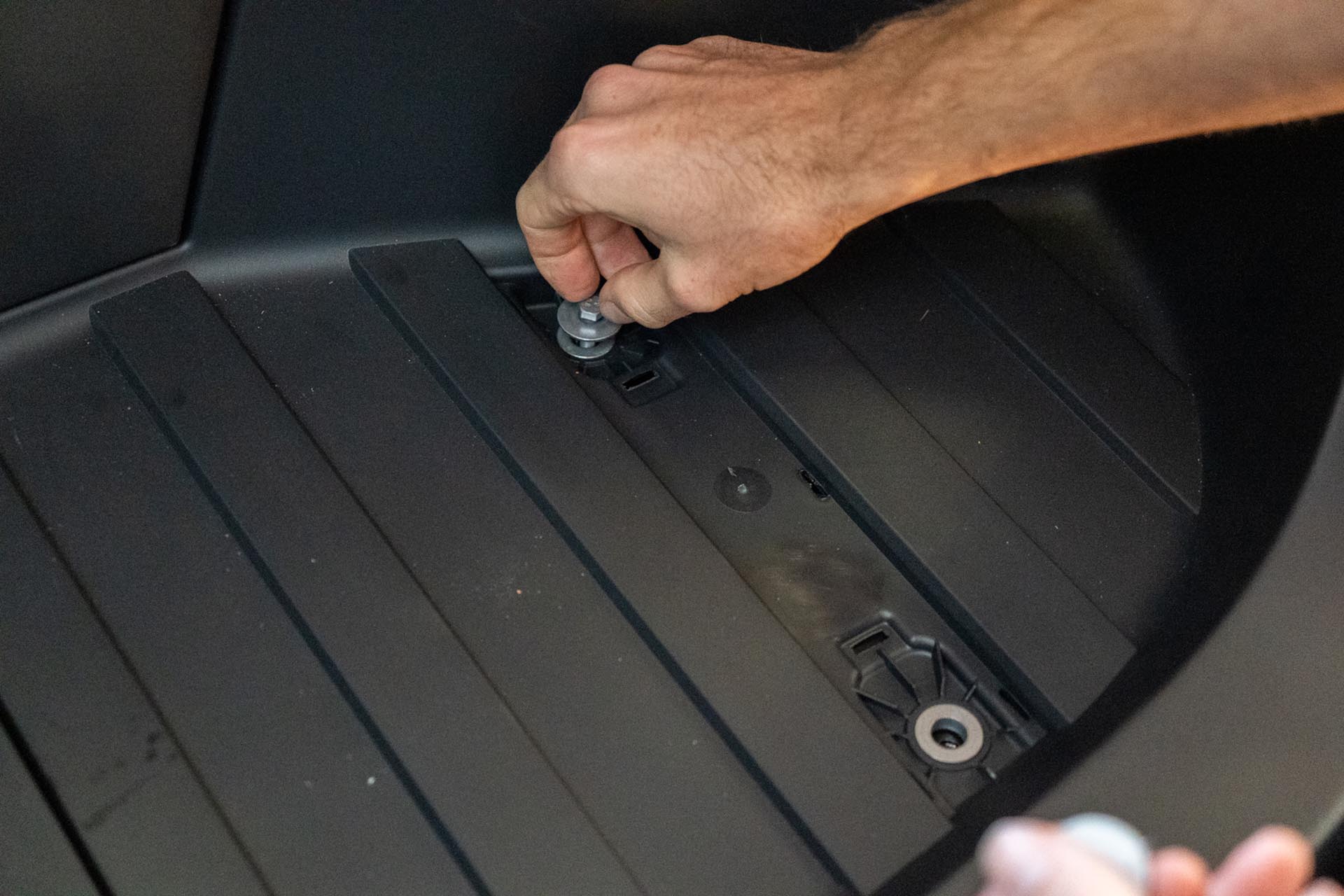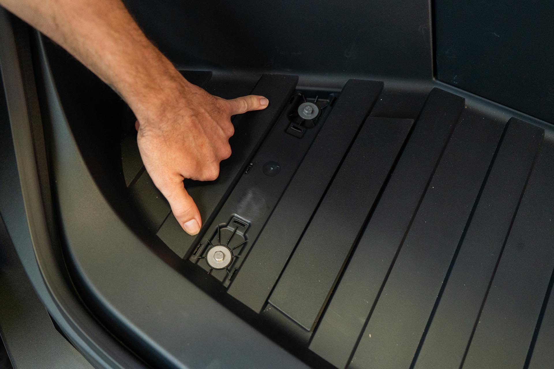 To access the factory power feed for the light bar, you’ll need to remove the front trunk tub assembly. Using a pry tool, remove the flap covers to expose (x4) 10mm bolts securing the front trunk tub to the vehicle.