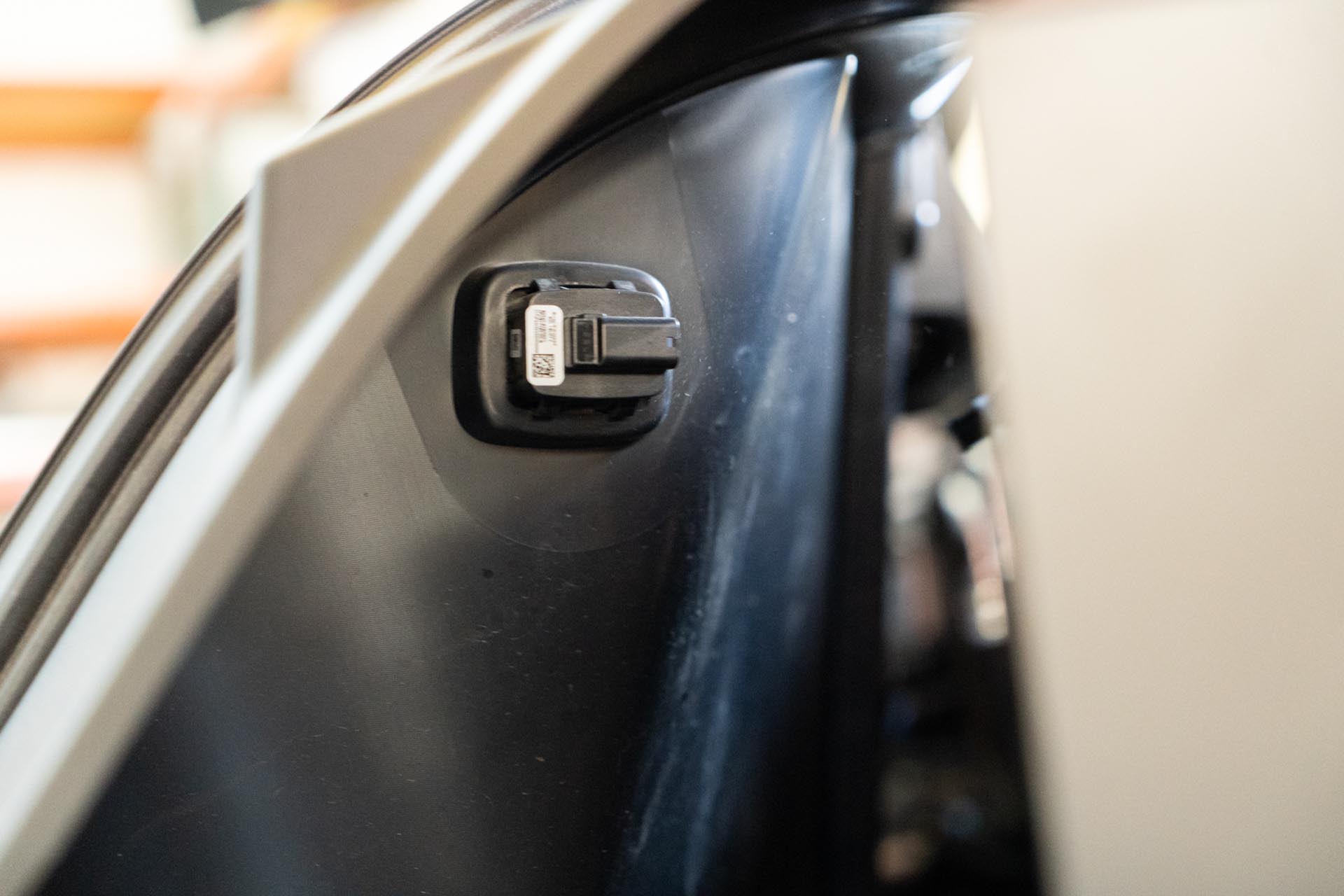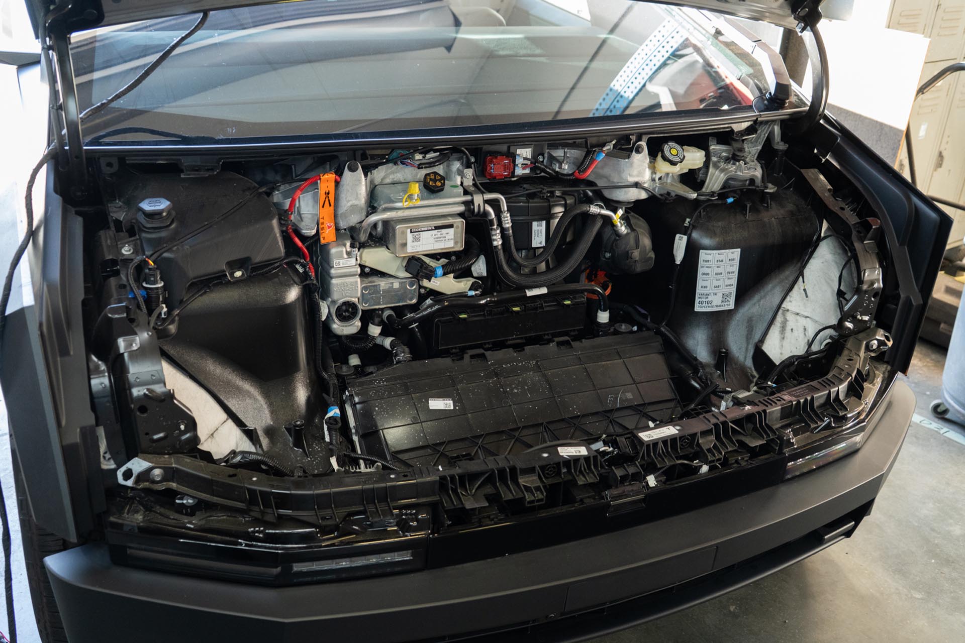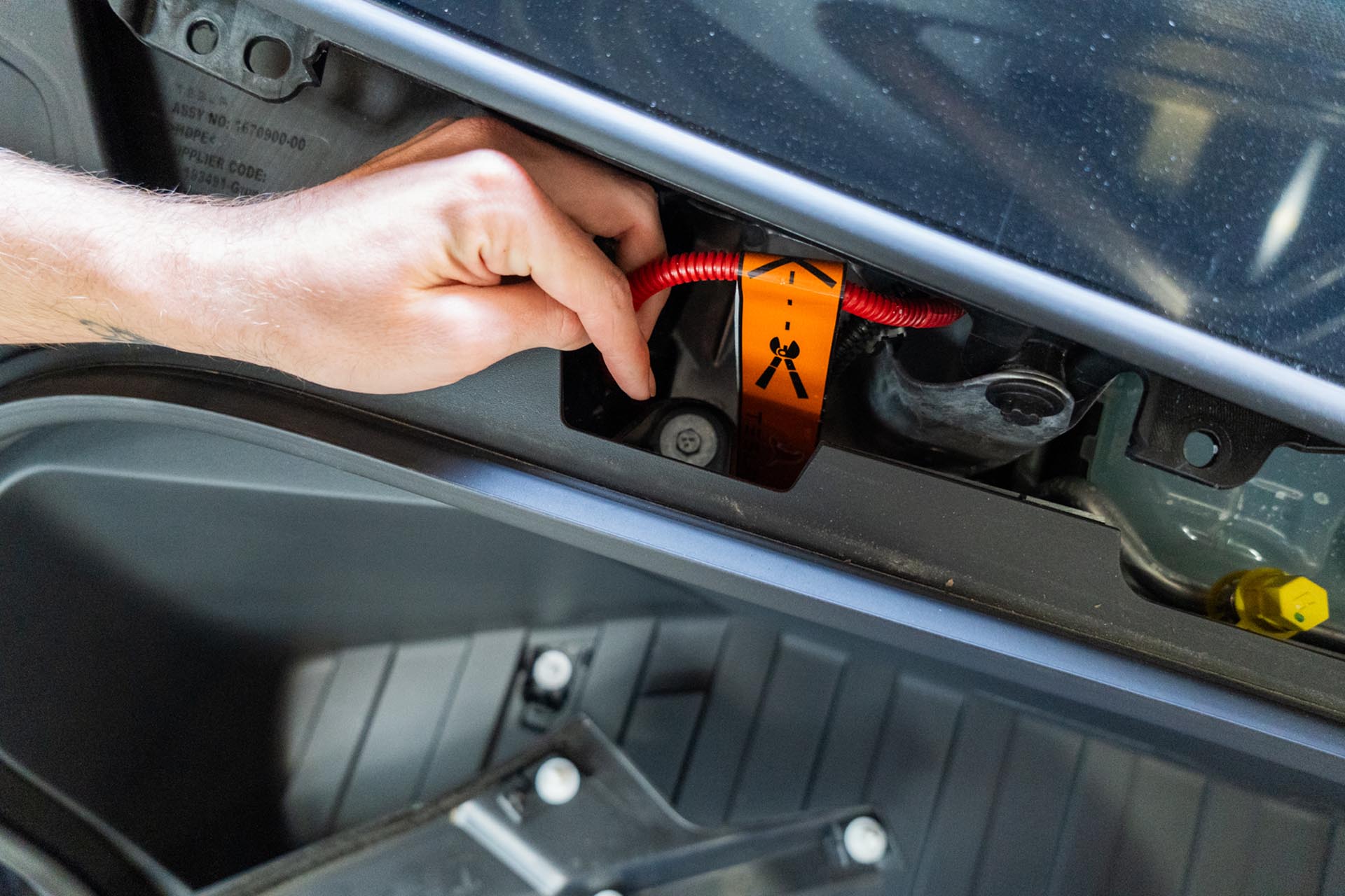 Next, disconnect the front trunk tub light power cable. This is right behind the driver-side tub edge.