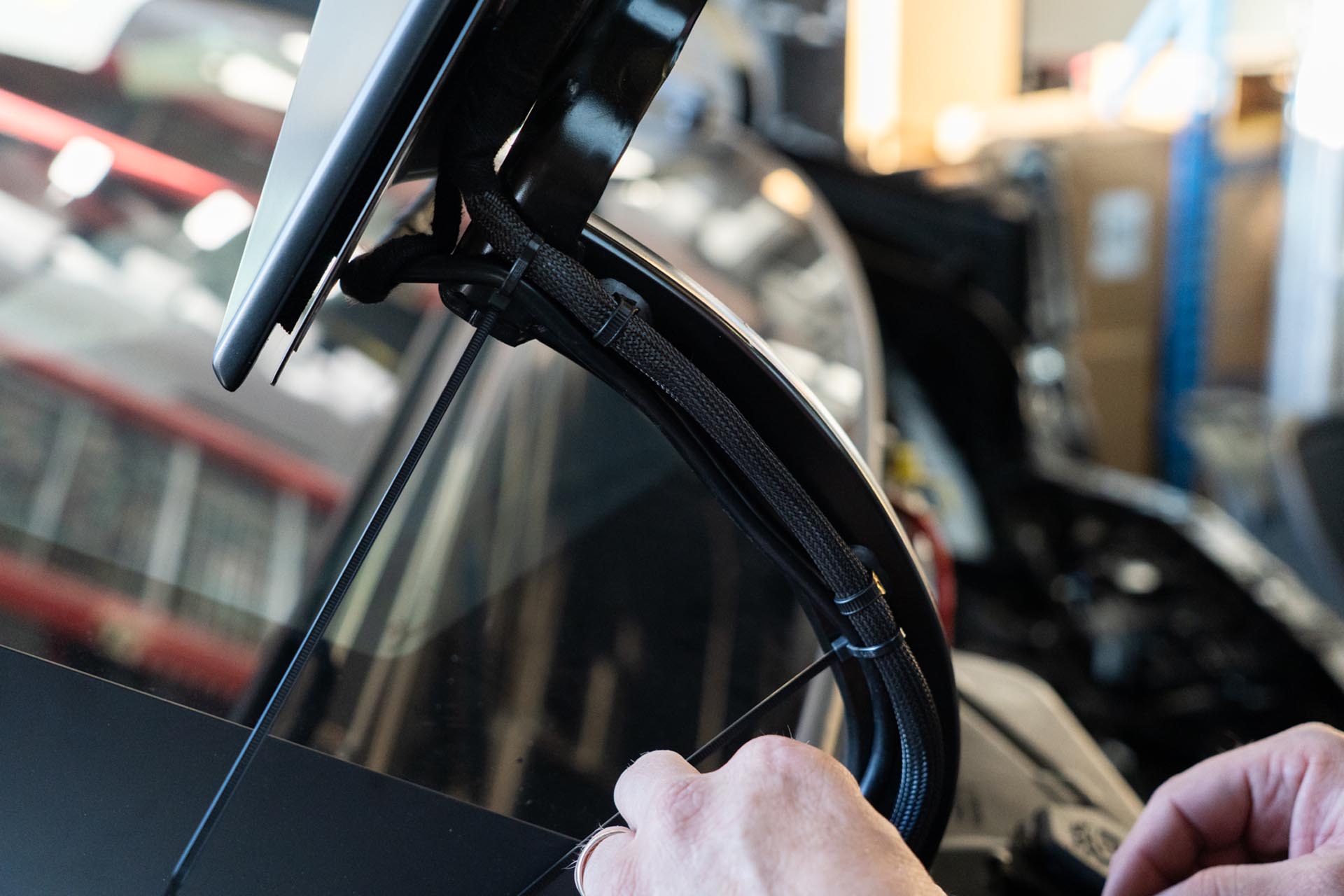 Proceed to manually open and close the hood to ensure that no tension is present in any of the added cable assemblies. Then using zip ties and tie offs, secure the new cables to the factory bus assembly.