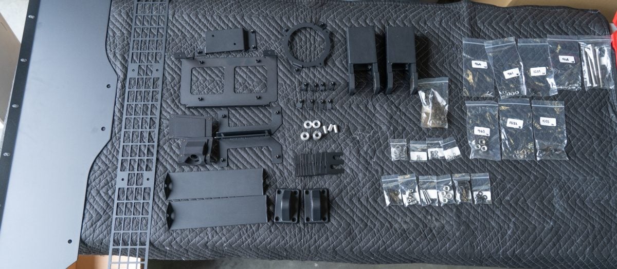 Using a 4mm allen key, fasten 4 provided bolts, washers, and spacers to secure the back side of the splash guard to the mid panel in the following orientation. Be sure to place the taller spacers on the outside with the 2x 45mm bolts, and the shorter spacers on the inside with the 2x 30mm bolts.