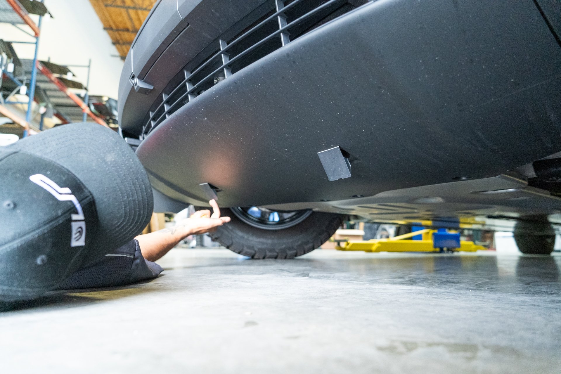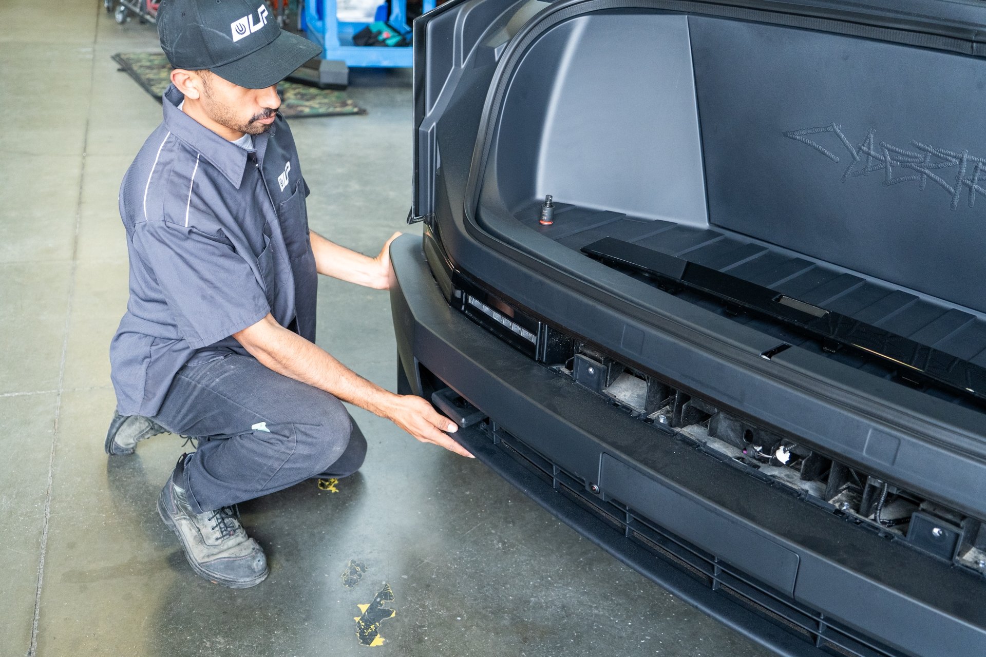 Using 2 people, slide the UP invincible bumper over the up invincible bumper mounts as shown below. Be sure to clear all wiring harnesses out of the way to mitigate damages. You may use the UP INVINCIBLE front bumper mounts to guide the UP INVINCIBLE bumper onto the vehicle.