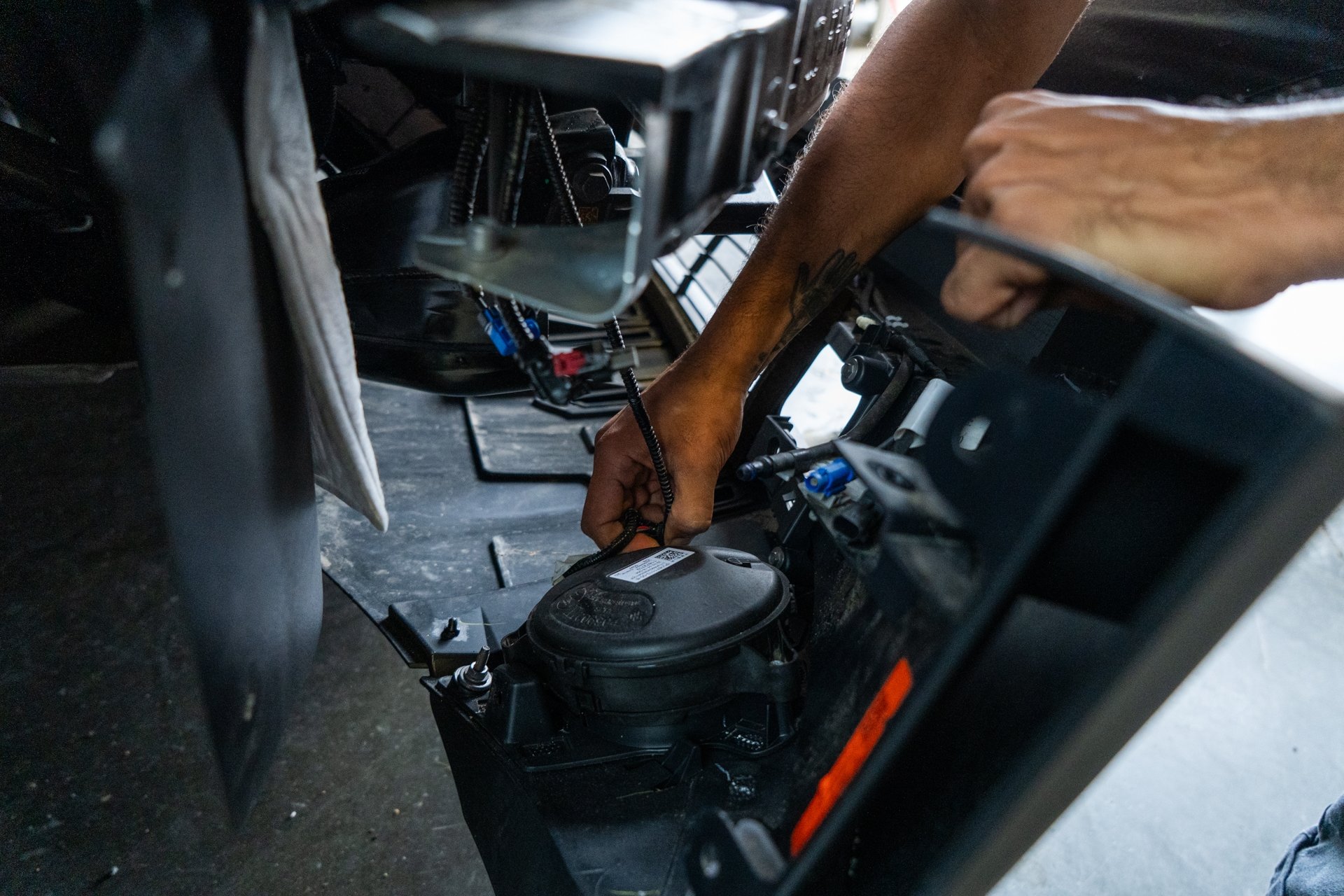 Next, plug the front speaker into the factory wiring harnesses near the passenger side fender liner.