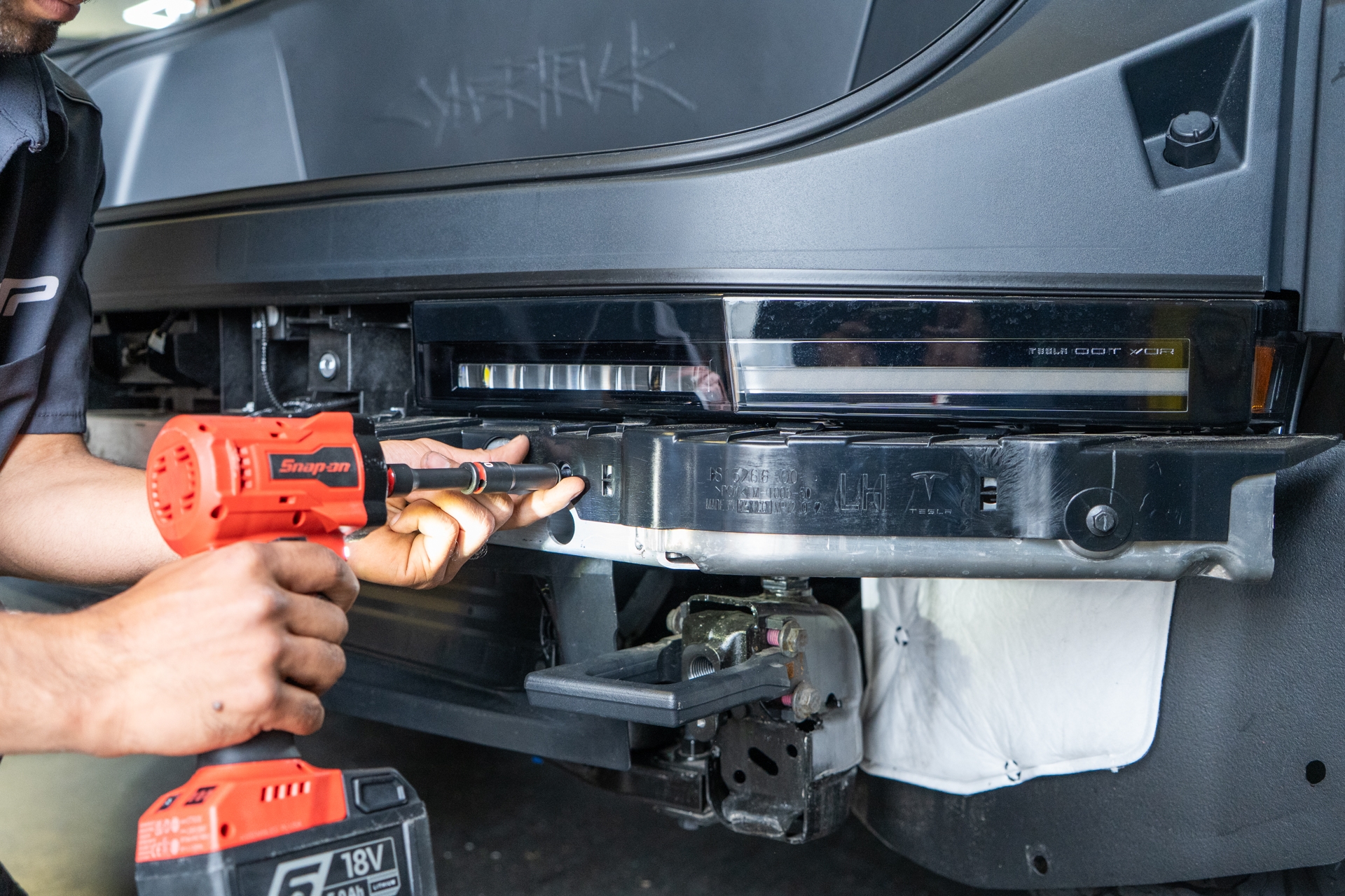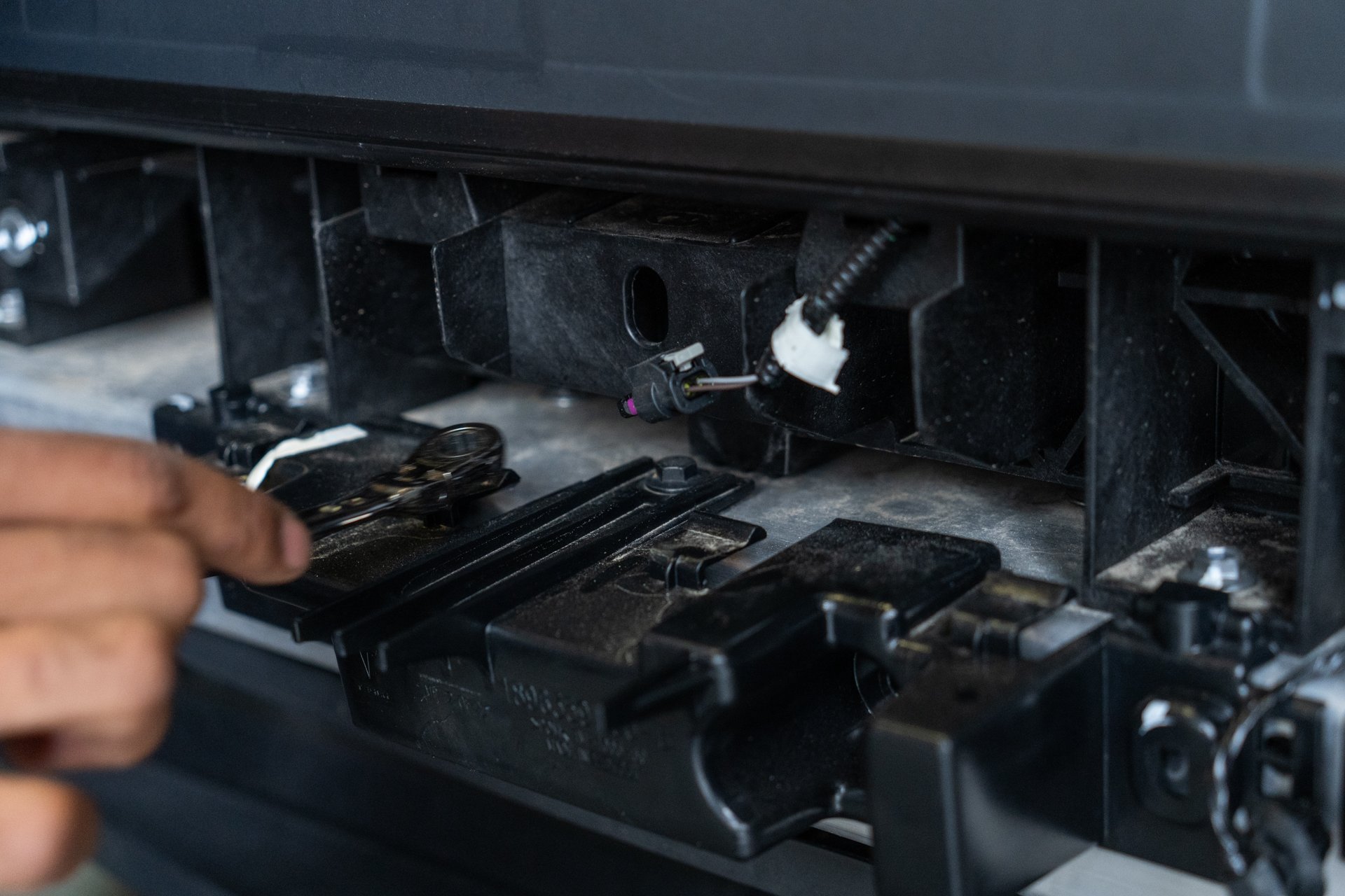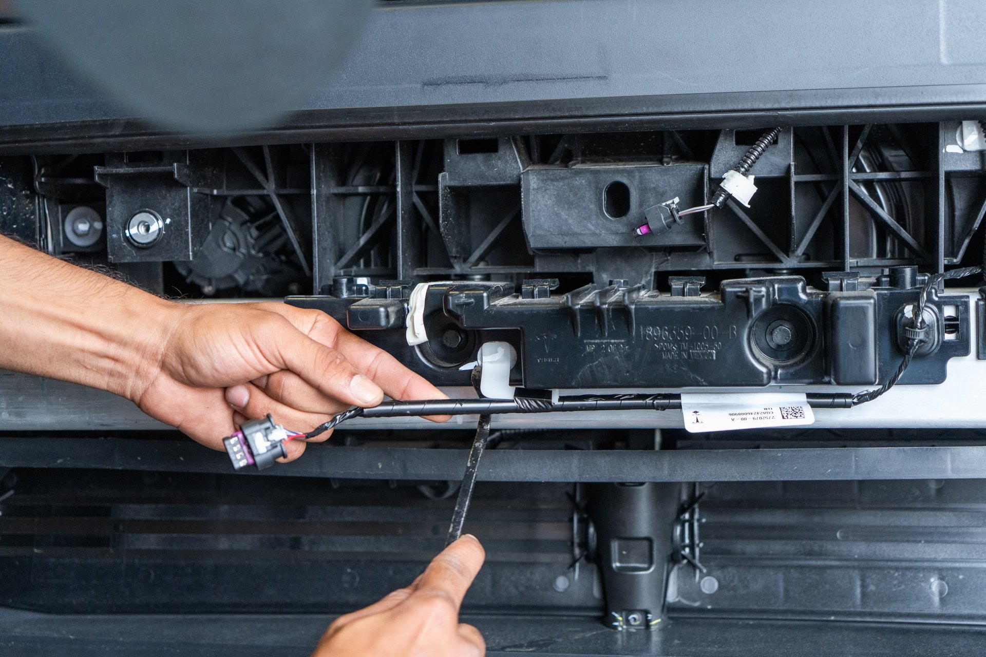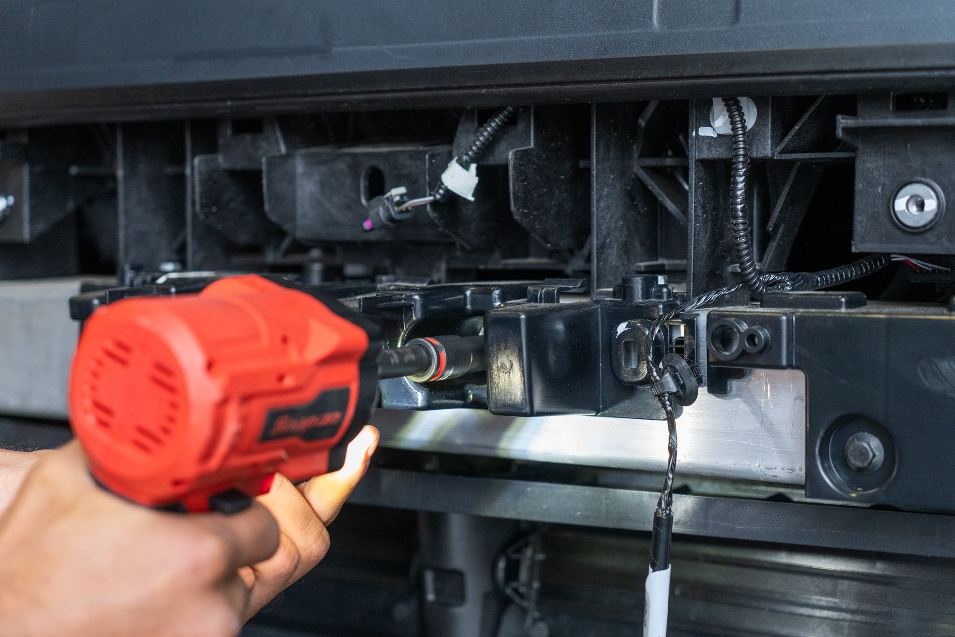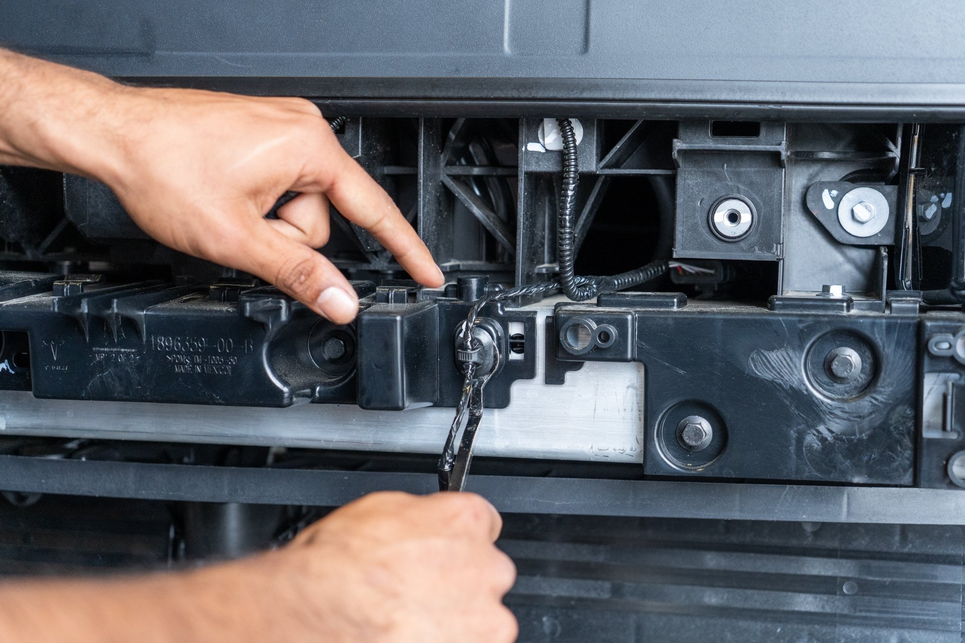 Next, using a 10mm socket, remove the Bluetooth sensor trim housing by removing all 11 bolts securing the trim piece to the factory crash beam. Note that the bluetooth sensor wiring harness must be disconnected before the housing trim piece has been removed from the crash beam, as well as the driver side wiring harnesses need to be removed using a pry tool before the bluetooth housing trim piece can be removed.