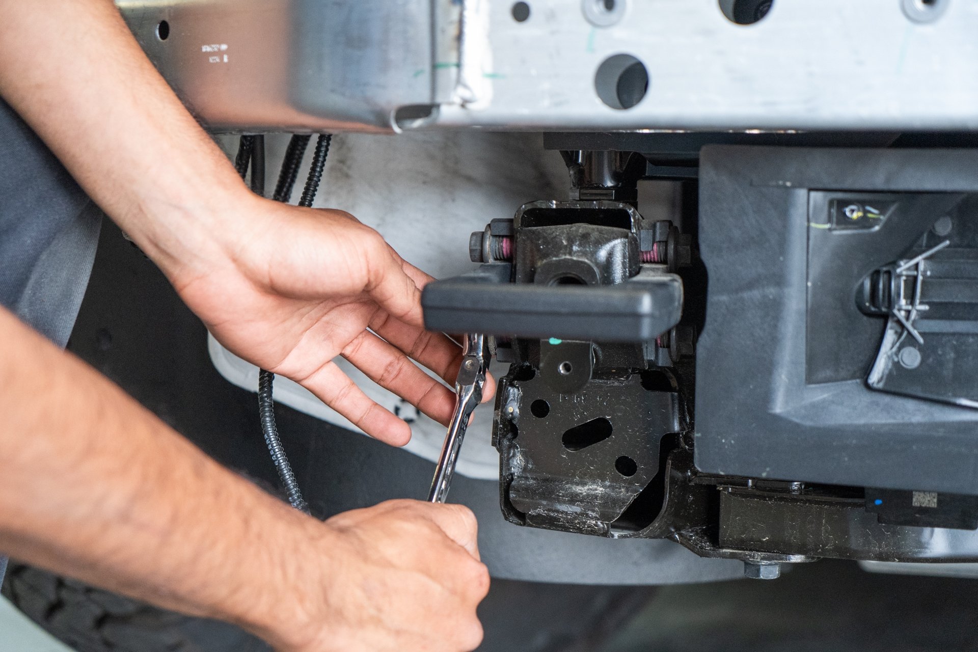 Using a 15mm end wrench, fasten 4 factory tow hook bolts to secure each UP INVINCIBLE bumper mounts to the vehicle.