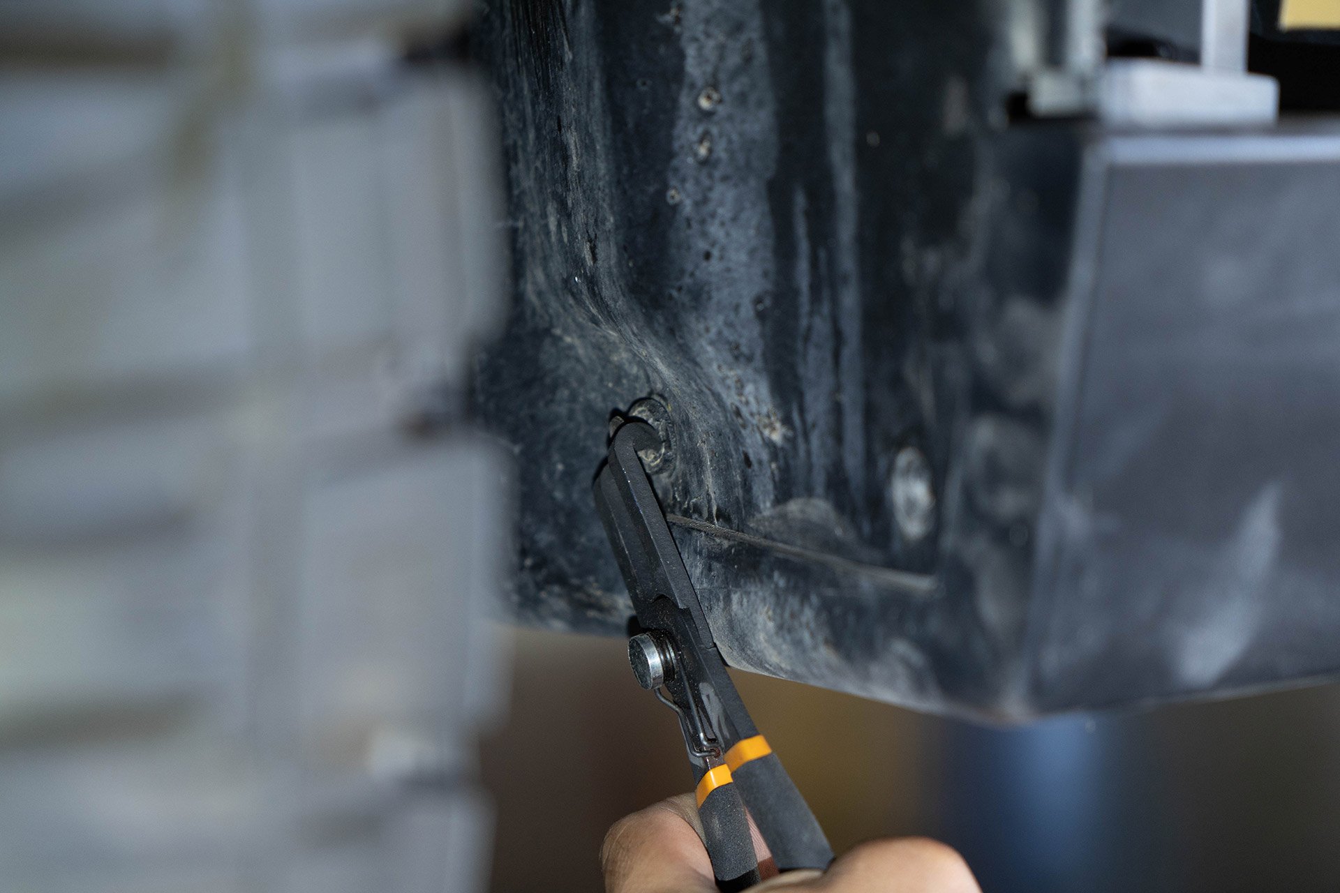 Using a 10mm socket, remove all 5 bolts securing the bottom of the OEM side skirt to the vehicle.