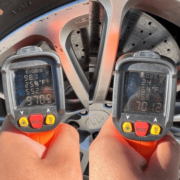 A safe rule of thumb is to immediately do a cool-down lap whenever the car identifies a brake overheating situation. While adding upgraded braking capacity can increase the thermal limits beyond the car’s knowledge, it is always better to be safe than sorry. Driving without heavy braking will allow time for the brake system to shed heat and for airflow to help cool the brakes down into a safer operating temperature. Additionally, for racers, we do advise applying heat-sensitive paint to monitor frequently the temperature peak ranges you’re seeing. This will help advise on safety as well as strategy. IR heat guns are also readily available online and can be a useful tool to measure brake temperatures after a run, here’s an example of an inexpensive (sub $60) Infrared-Thermometer.