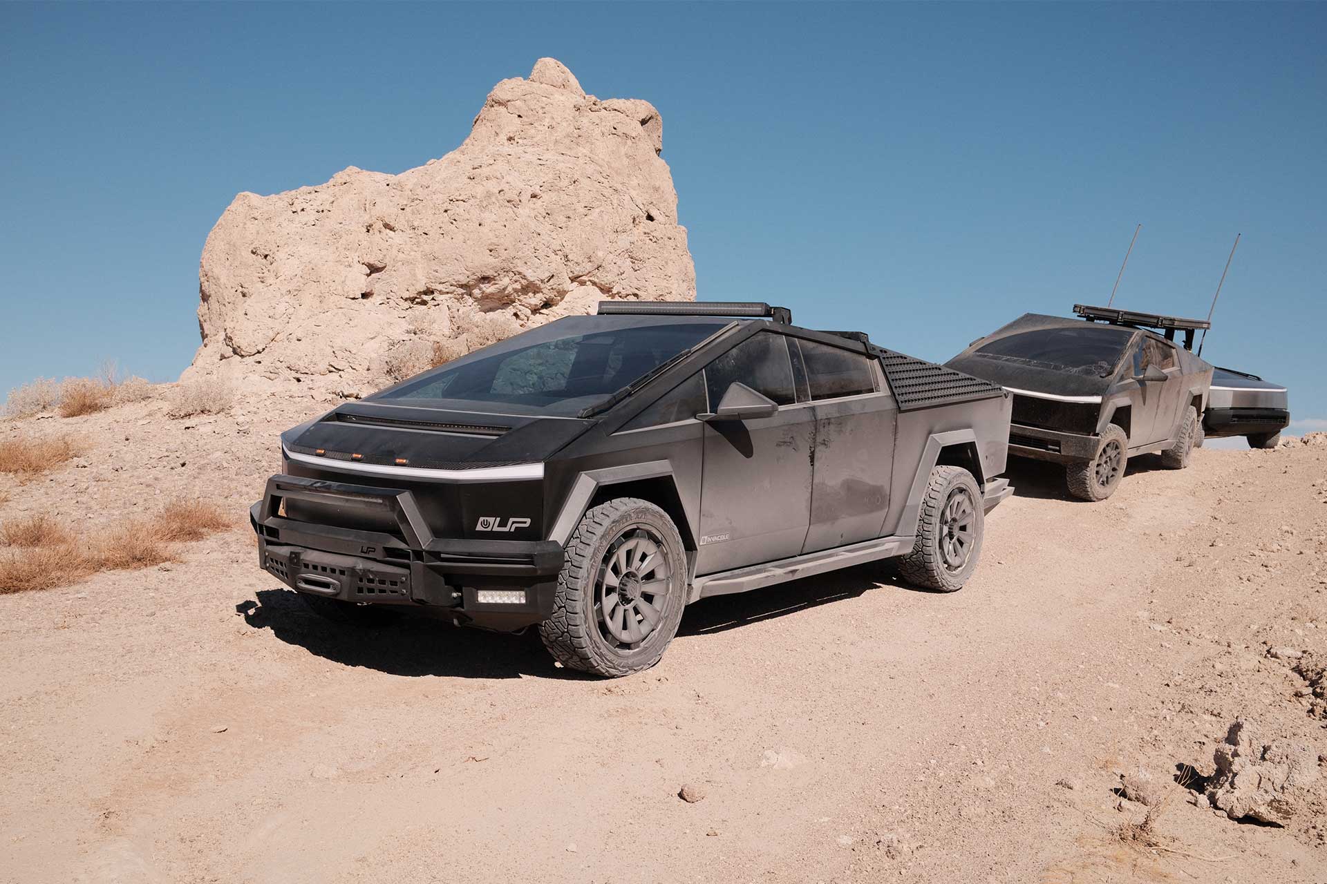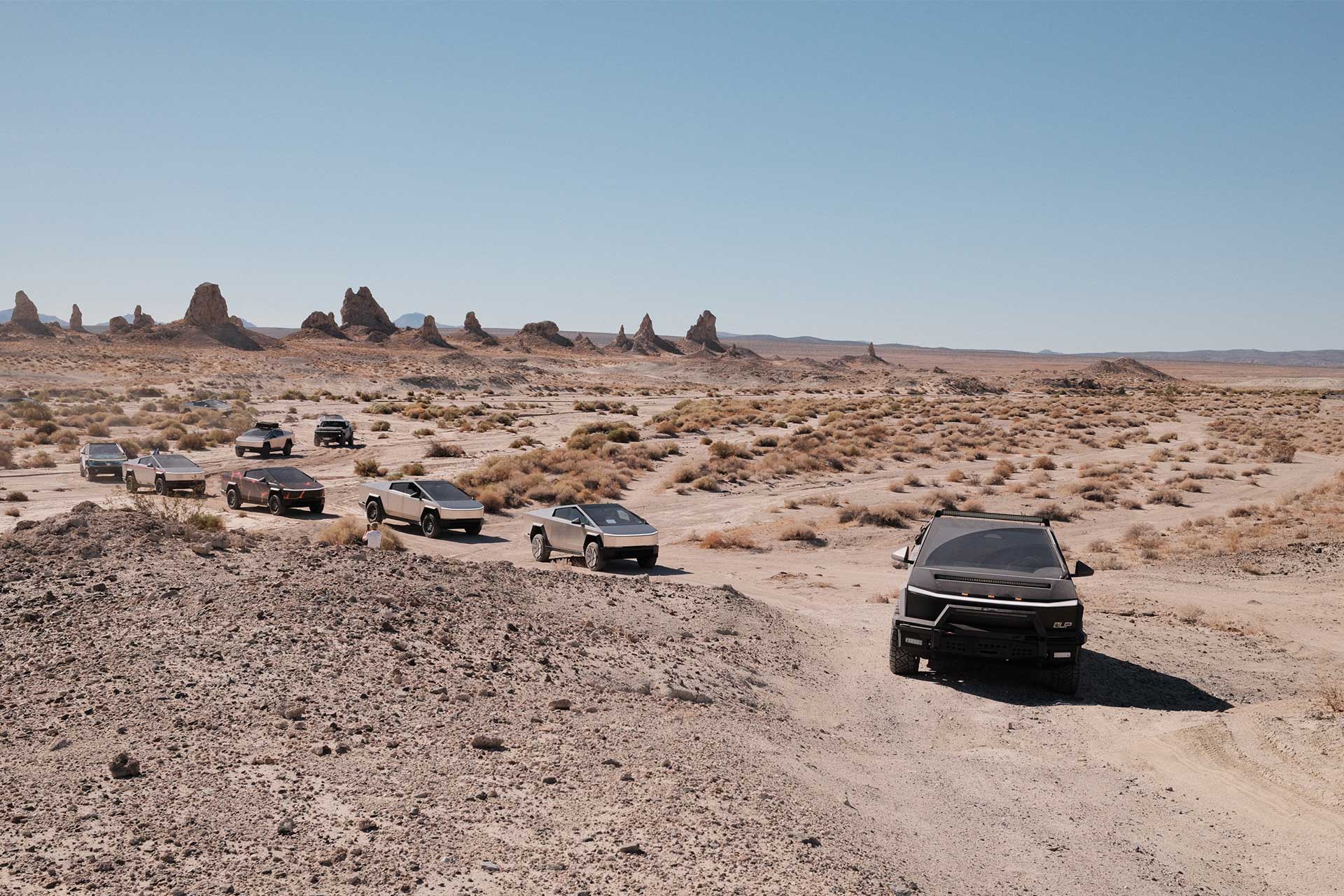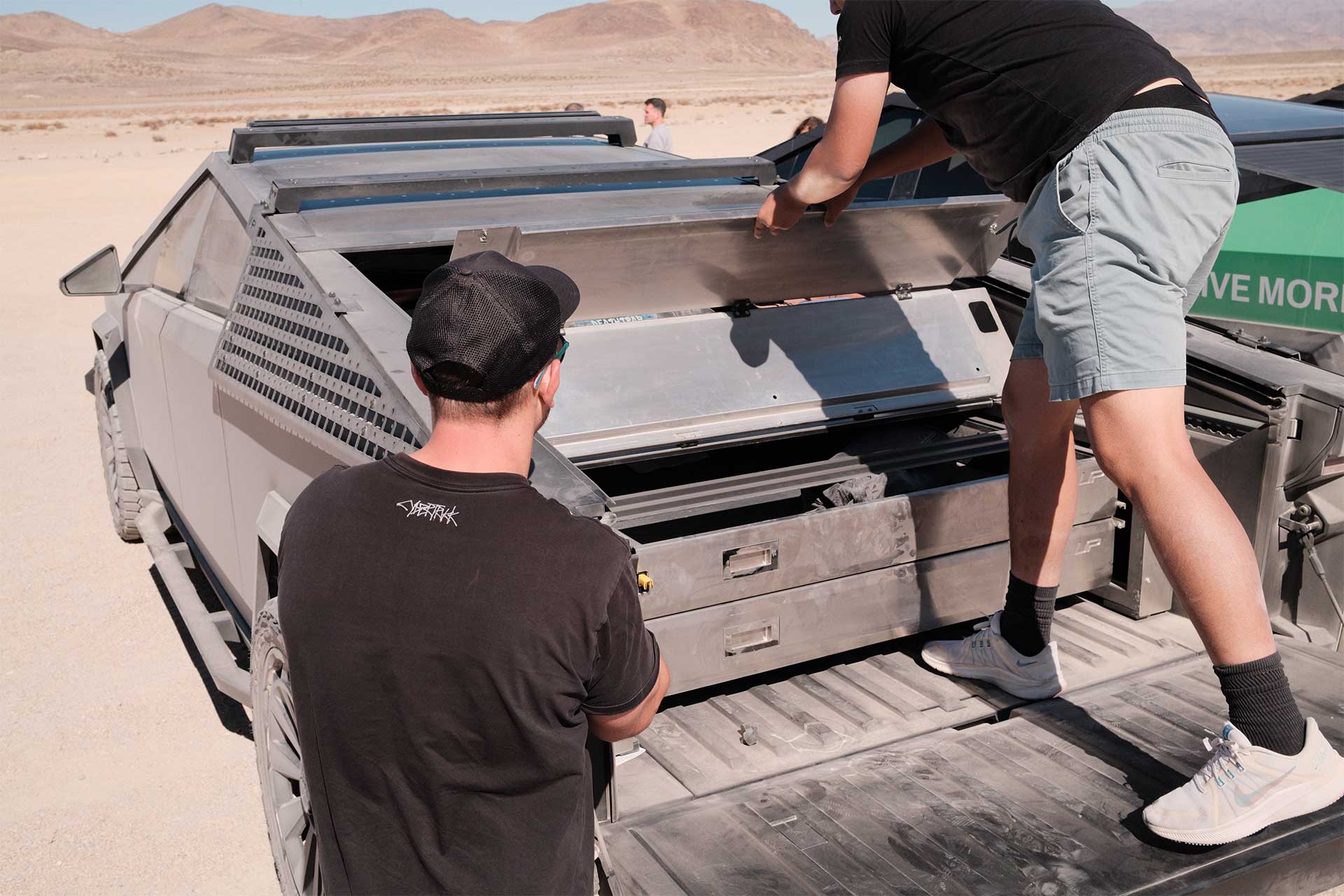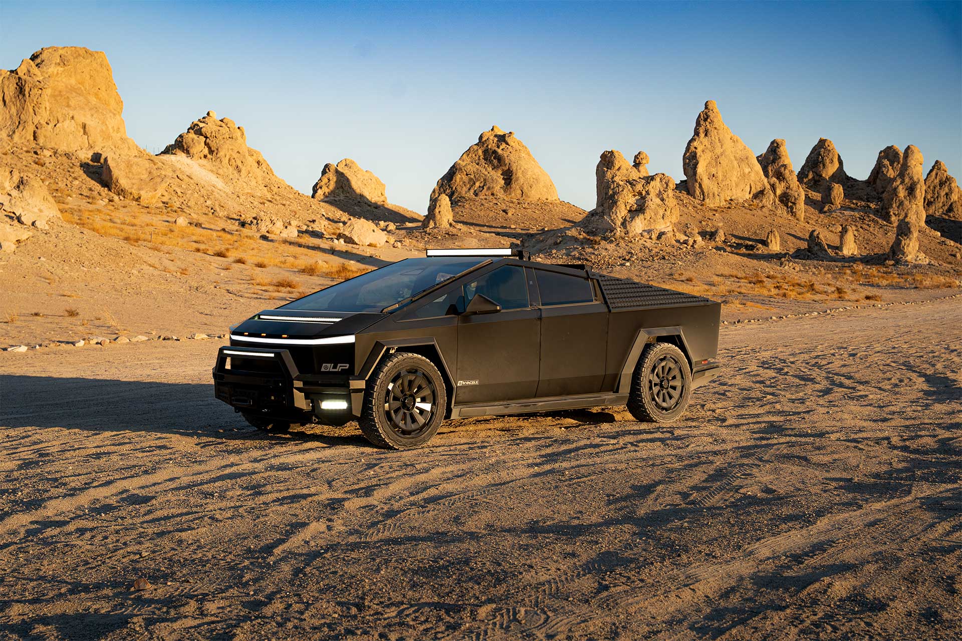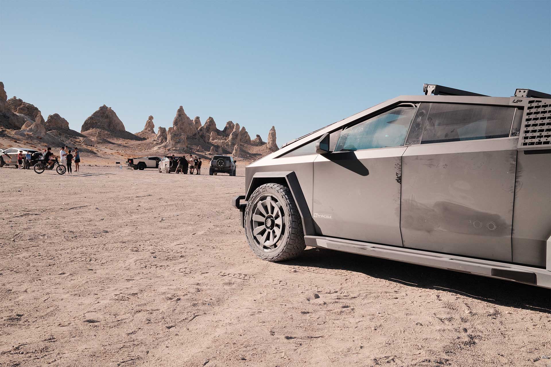 We later spent time with attendees answering questions about our build, doing some off road excursions around the Trona Pinnacles, and even got to show the prototype bed storage system that adds secure space for recovery gear and camp essentials. Wheel and tire conversations circled back to the same point. Our 24 inch CYBRNOVA with Recon Grapplers handled the highway and the trail. We reached Inyokern on one charge from Hawthorne, wheeled with the group, and returned to the Supercharger without drama. Steering feel remained predictable, sidewall support was solid at trail pressures, and range stayed consistent. If you have avoided 24s because of efficiency worries, this trip is a practical counterpoint. With the right tire, driving style, and route planning, big wheels can work for just about any adventure.